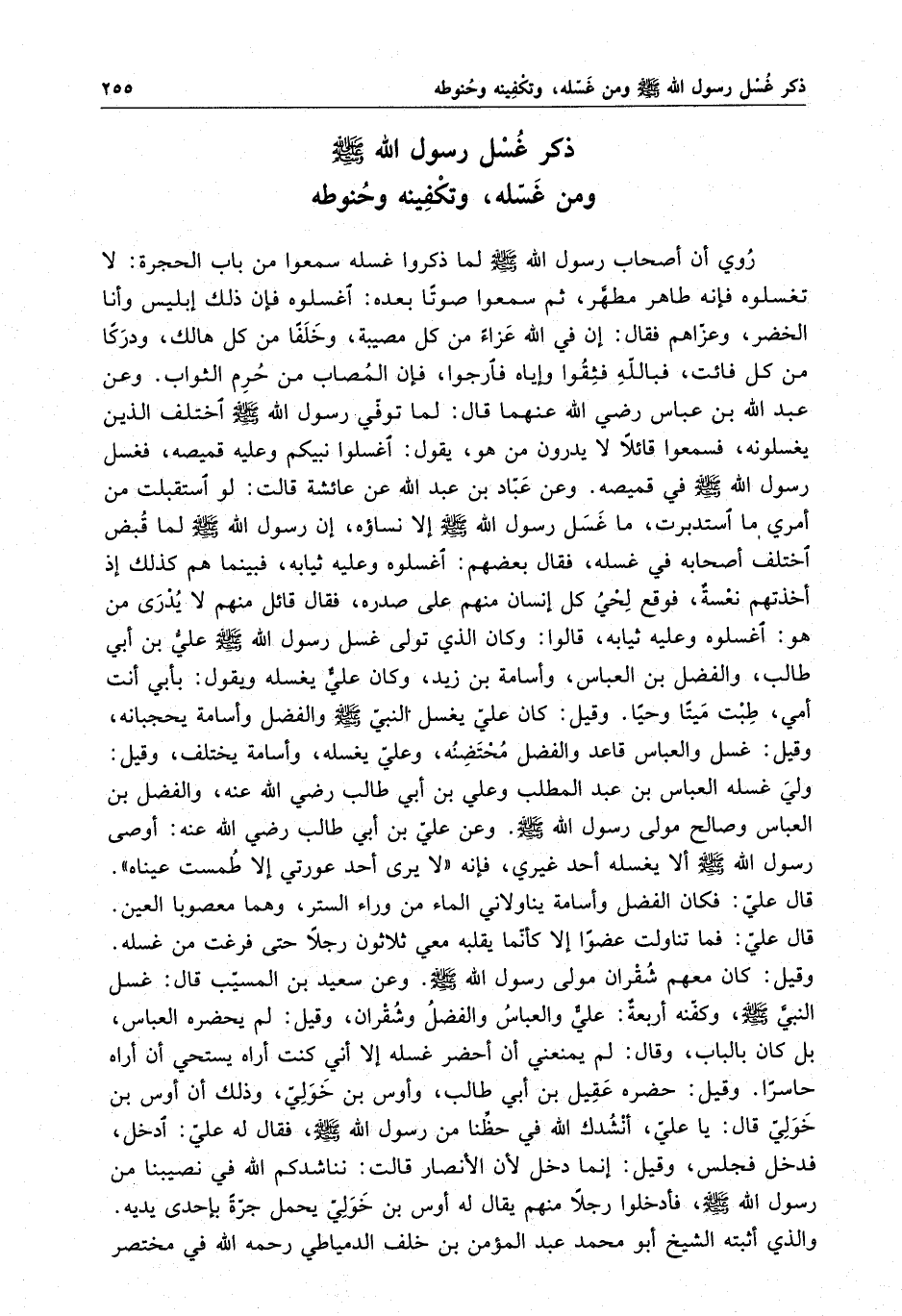 روي أن أصحاب رسول الله ( صلى الله عليه وسلم ) لما ذكروا غسله سمعوا من باب الحجرة : لا تغسلوه فإنه طاهر مطهر ، ثم سمعوا صوتاً بعده : اغسلوه فإن ذلك إبليس وأنا الخضر ، وعزاهم فقال : إن في الله عزاءً من كل مصيبة ، وخلفا من كل هالك ، ودركاً من كل فائت ، فبالله فثقوا وإياه فآرجوا ، فإن المصاب من حرم الثواب . وعن عبد الله بن عباس رضي الله عنهما قال : لما توفي رسول الله ( صلى الله عليه وسلم ) اختلف الذين يغسلونه ، فسمعوا قائلاً لا يدرون من هو ، يقول : اغسلوا نبيكم وعليه قميصه ، فغسل رسول الله ( صلى الله عليه وسلم ) في قميصه . وعن عباد بن عبد الله عن عائشة قالت : لو استقبلت من أمري ما استدبرت ، ما غسل رسول الله ( صلى الله عليه وسلم ) إلا نساؤه ، إن رسول الله ( صلى الله عليه وسلم ) لما قبض اختلف أصحابه في غسله ، فقال بعضهم : اغسلوه وعليه ثيابه ، فبينما هم كذلك إذ أخذتهم نعسةٌ ، فوقع لحي كل إنسان منهم على صدره ، فقال قائل منهم لا يدري من هو : اغسلوه وعليه ثيابه ، قالوا : وكان الذي تولى غسل رسول الله ( صلى الله عليه وسلم ) علي بن أبي طالب ، والفضل بن العباس ، وأسامة بن زيد ، وكان علي يغسله ويقول : بأبي أنت وأمي طبت ميتاً وحياً . وقيل : كان علي يغسل النبي ( صلى الله عليه وسلم ) والفضل وأسامة يحجبانه ، وقيل : غسل والعباس قاعد والفضل محتضنه ، وعلي يغسله ، وأسامه يختلف ، وقيل : ولى غسله العباس بن عبد المطلب وعلي بن أبي طالب رضي الله عنه ، والفضل بن العباس وصالح مولى رسول الله ( صلى الله عليه وسلم ) . وعن علي بن أبي طالب رضي الله عنه : أوصى رسول الله ( صلى الله عليه وسلم ) ألا يغسله أحد غيري ، فإنه " لا يرى أحد عورتي إلا طمست عيناه " . قال علي : فكان الفضل وأسامة يناولاني الماء من وراء الستر ، وهما معصوبا العين . قال علي : فما تناولت عضواً إلا كأنما يقلبه معي ثلاثون رجلاً حتى فرغت من غسله . وقيل : كان معهم شقران مولى رسول الله ( صلى الله عليه وسلم ) . وعن سعيد بن المسيب قال : غسل النبي ( صلى الله عليه وسلم ) ، وكفنه أربعةٌ علي والعباس والفضل وشقران ، وقيل : لم يحضره العباس ، بل كان بالباب ، وقال : لم يمنعني أن أحضر غسله إلا أني كنت أراه يستحي أن أراه حاسراً . وقيل : حضره عقيل بن أبي طالب ، وأوس بن خولي ، وذلك أن أوس بن خولي قال : يا علي ، أنشدك الله في حظنا من رسول الله ( صلى الله عليه وسلم ) ، فقال له علي : ادخل ، فدخل فجلس ، وقيل : إنما دخل لأن الأنصار قالت : نناشدكم الله في نصيبنا من رسول الله ( صلى الله عليه وسلم ) ، فأدخلوا رجلاً منهم يقال له أوس بن خولي يحمل جرةً بإحدى يديه ، والذي أثبته الشيخ أبو محمد عبد المؤمن بن خلف الدمياطي رحمه الله في مختصر