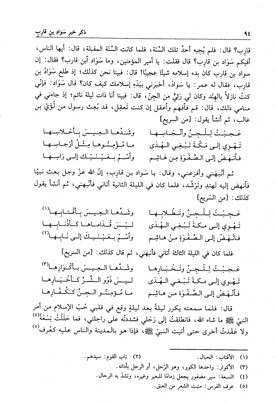 قارب ؟ قال : فلم يجبه أحدٌ تلك السنة ، فلما كانت السنة المقبلة ، قال : أيها الناس ، أفيكم سواد بن قارب ؟ قال فقلت : يا أمير المؤمنين ، وما سواد ابن قارب ؟ فقال : إن سواد بن قارب كان بدء إسلامه شيئاً عجيباً قال : فبينا نحن كذلك ، إذا طلع سواد بن قارب ، فقال له عمر : يا سواد ، أخبرني ببدء إسلامك كيف كان ؟ قال سواد : فإني كنت نازلاً بالهند وكان لي رئيٌّ من الجن ، قال : فبينا أنا ذات ليلة نائم ؛ إذ جاءني في منامي ذلك ، قال : قم فافهم واعقل إن كنت تعقل ، قد بعث رسول من لؤيّ بن غالب ، ثم أنشأ يقول :