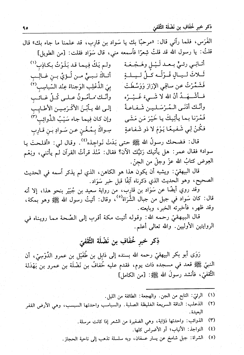 روى أبو بكر البيهقيّ رحمه الله بسنده غلى ذابل بن طفيل بن عمرو الدّوسيّ ، أن النبي ( صلى الله عليه وسلم ) قعد في مسجده ذات يوم ، فقدم عليه خفاف بن نضلة ابن عمرو بن بهدلة الثقفيّ ، فأنشد رسول الله ( صلى الله عليه وسلم ) :