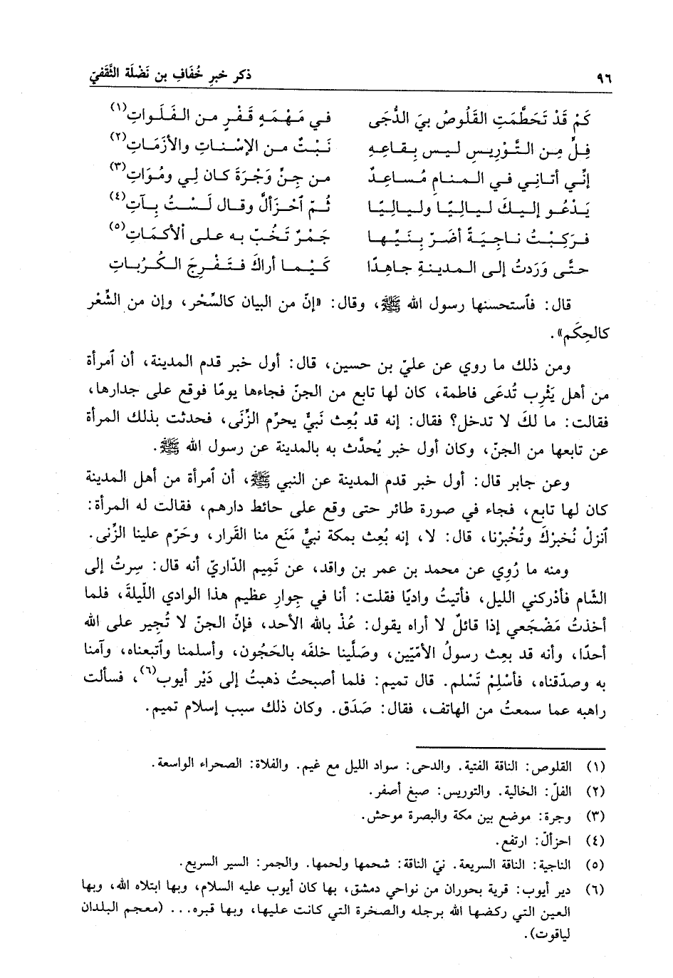 ومنه ما روى عن محمد بن عمر بن واقد ، عن تميم الداري أنه قال : سرت إلى الشام فأدركني الليل ، فأتييت وادياً فقلت : أنا في جوار عظيم هذا الوادي الليلة ، فلما أخذت مضجعي إذ قائلٌ لا أراه يقول : عذ بالله الأحد ، فإن الجن لا تجير على الله أحدا ، وأنه قد بعث رسول الأميين ، وصلينا خلفه بالحجون ، وأسلمنا واتبعناه ، وآمنا به وصدقناه ، فأسلم تسلم . قال تميم : فلما أصبحت ذهبت إلى دير أيوب ، فسألت راهبة عما سمعت من الهاتف ، فقال : صدق . وكان ذلك سبب إسلام تميم .