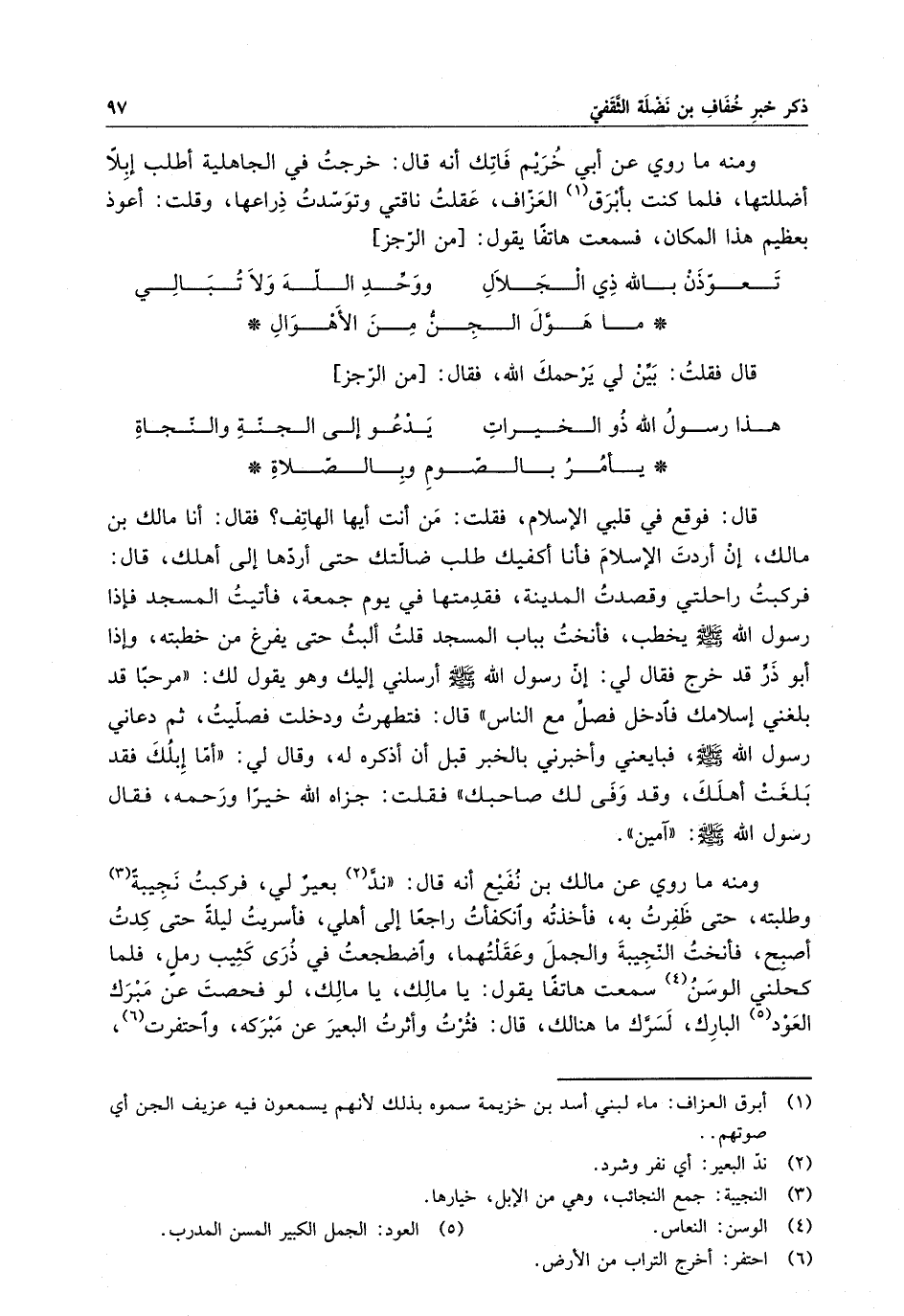 قال : فوقع في قلبي الإسلام ، فقلت : من أنت أيها الهاتف ؟ فقال : أنا مالك بن مالك ، إن أردت الإسلام فأنا أكفيك طلب ضالتك حتى أردها إلى أهلك ، قال : فركبت راحلتي وقصدت المدينة ، فقدمتها في يوم جمعة ، فأتيت المسجد فإذا رسول الله ( صلى الله عليه وسلم ) يخطب ، فأنخت بباب المسجد قلت ألبث حتى يفرغ من خطبته ، وإذا أبو ذر قد خرج فقال لي : إن رسول الله ( صلى الله عليه وسلم ) أرسلني إليك وهو يقول لك : " مرحباً قد بلغني إسلامك فادخل فصل مع الناس " قال فتطهرت ودخلت فصليت ، ثم دعاني رسول الله ( صلى الله عليه وسلم ) ، فبايعني وأخبرني بالخبر قبل أن أذكره له ، وقال لي : " أما إبلك فقد بغت أهلك ، وقد وفى لك صاحبك " فقلت : جزاه الله خيرا ورحمة ، فقال رسول الله ( صلى الله عليه وسلم ) : " آمين " . ومنه ما روى عن مالك بن نفيع أنه قال : ند بعيرٌ لي ، فركبت نجيبة وطبنة ، حتى ظفرت به ، فأخذته وانكفأت راجعاً إلى أهلي ، فأسريت ليلةً حتى كدت أصبح ، فأنخت النجيبة والجمل وعقلتهما ، واضجعت في ذرى كثيب رملٍ ، فلما كحلني الوسن سمعت هاتفاً يقول : يا مالك ، يا مالك ، لو فحصت عن مبرك العود البارك ، لسرك ما هنالك ، قال : فثرت وأثرت البعير عن مبركه ، واحتفرت ،