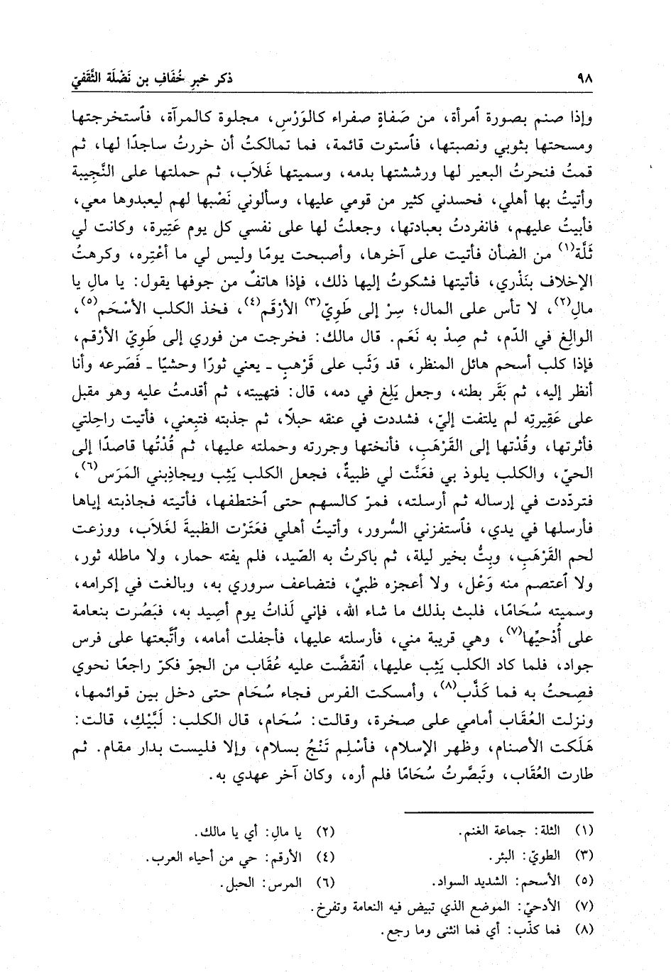 ثم قدتها قاصداً إلى الحي ، والكلب يلوذ بي فعنت لي ظبيةٌ ، فجعل الكلب يثب ويجاذبني المرس ، فترددت في إرساله ثم أرسلته ، فمر كالسهم حتى اختطفها فأتيته فجذبته إياها فأرسلها في يدي ، فاستفزني السرور ، وأتيت أهلي فعترت الظبية لغلاب ، ووزعت لحم القرهب ، وبت بخير ليلة ، ثم باركت به الصيد ، فلم يفته حمار ، ولا ما طله ثور ، ولا اعتصم منه وعل ، ولا أعجزه ظبيٌ ، فتضاعف سروري به ، وبالغت في إكرامه ، وسميته سحاما ، فلبث بذلك ما شاء الله ، فإنى لذات يوم أصيد به ، فبصرت بنعامة على أدحيها ، وهي قريبة منى ، فأرسلته عليها ، فأجفلت أمامه ، واتبعتها على فرس جواد ، فلما كاد الكلب يثب عليها ، انقضت عليه عقاب من الجو فكر راجعاً نحوي فصحت به فما كذب ، وأمسكت الفرس فجاء سحام حتى دخل بين قوائمها ، ونزلت العقاب أمامي على صخرة ، وقالت : سحام ، قال الكلب : لبيك ، قالت : هلكت الأصنام ، وظهر الإسلام ، فأسلم تنج بسلام ، وإلا فليست بدار مقام . ثم طارت العقاب ، وتبصرت سحاما فلم أره ، وكان آخر عهدي به .