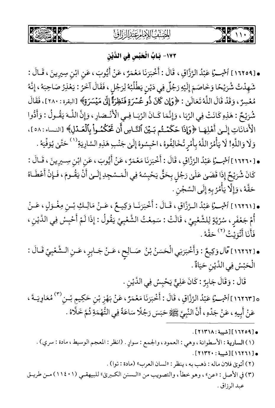 • [١٦٢٦٠] أخبرنا عَبْدُ الرَّزَّاقِ، قَالَ: أَخْبَرَنَا مَعْمَرٌ، عَنْ أَيُّوبَ، عَنِ ابْنِ سِيرِينَ، قَالَ: كَانَ شُرَيْحٌ إِذَا قَضَى عَلَى رَجُلٍ بِحَقٍّ يَحْبِسُهُ فِي الْمَسْجِدِ إِلَى أَنْ يَقُومَ، فَإِنْ أَعْطَاهُ حَقَّه، وَإِلَّا يَأْمُرُ بِهِ إِلَى السِّجْنِ.