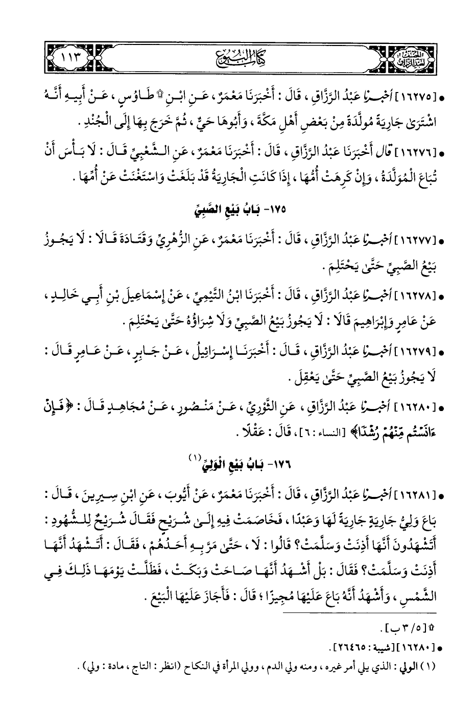 • [١٦٢٧٧] أخبرنا عَبْدُ الرَّزَّاقِ، قَالَ: أَخْبَرَنَا مَعْمَرٌ، عَنِ الزُّهْرِيِّ وَقَتَادَةَ قَالَا: لَا يَجُوزُ بَيْعُ الصَّبِيِّ حَتَّى يَحْتَلِمَ.