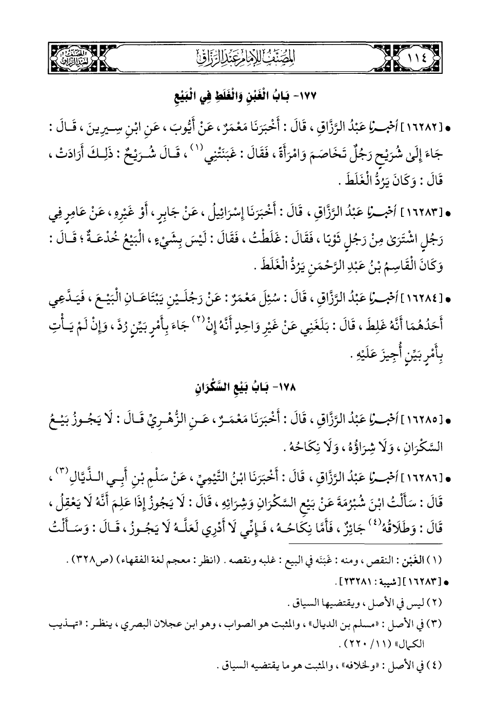 • [١٦٢٨٤] أخبرنا عَبْدُ الرَّزَّاقِ، قَالَ: سُئِلَ مَعْمَرٌ: عَنْ رَجُلَيْنِ يَبْتَاعَانِ الْبَيْعَ، فَيَدَّعِي أَحَدُهُمَا أَنَّهُ غَلِطَ، قَالَ: بَلَغَنِي عَنْ غَيْرِ وَاحِدٍ أَنَّهُ إِنْ (¬٢) جَاءَ بِأَمْرٍ بَيِّنٍ رُدَّ، وَإِنْ لَمْ يَأْتِ بِأَمْرٍ بَيِّنٍ أُجِيزَ عَلَيْهِ.