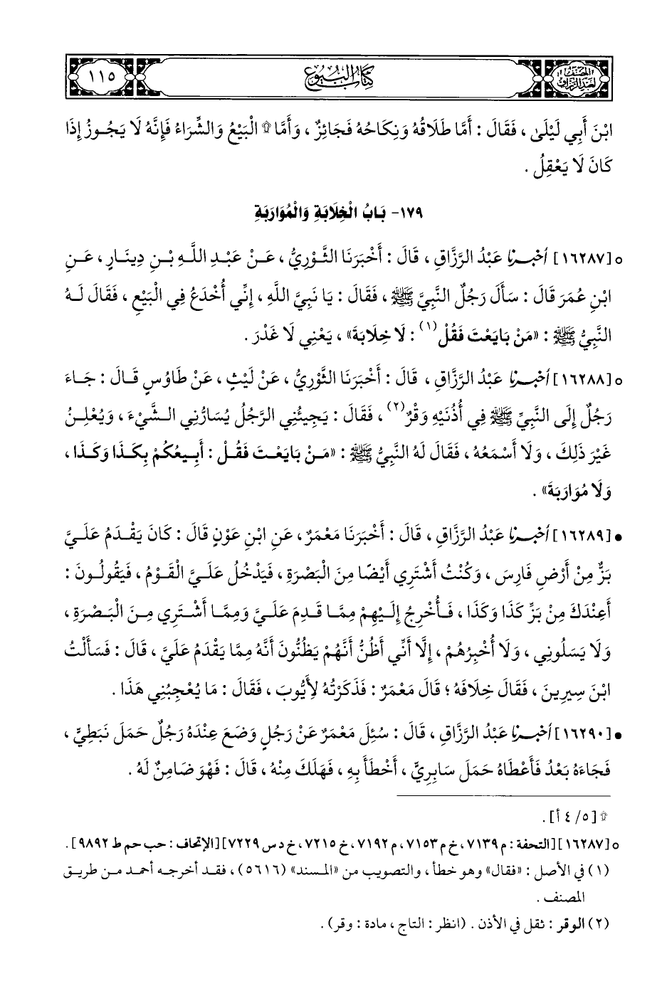 ° [١٦٢٨٨] أخبرنا عَبْدُ الرَّزَّاقِ، قَالَ: أَخْبَرَنَا الثَّوْرِيُّ، عَنْ لَيْثٍ، عَنْ طَاوُسٍ قَالَ: جَاءَ رَجُلٌ إِلَى النَّبِيِّ - صلى الله عليه وسلم - فِي أُذُنَيْهِ وَقْرٌ (¬٢)، فَقَالَ: يَجِيئُنِي الرَّجُلُ يُسَارُّنِي الشَّيْءَ، وَيُعْلِنُ غَيْرَ ذَلِكَ، وَلَا أَسْمَعُه، فَقَالَ لَهُ النَّبِيُّ - صلى الله عليه وسلم -: "مَنْ بَايَعْتَ فَقُلْ: أَبِيعُكُمْ بِكَذَا وَكَذَا، وَلَا مُوَارَبَةَ".