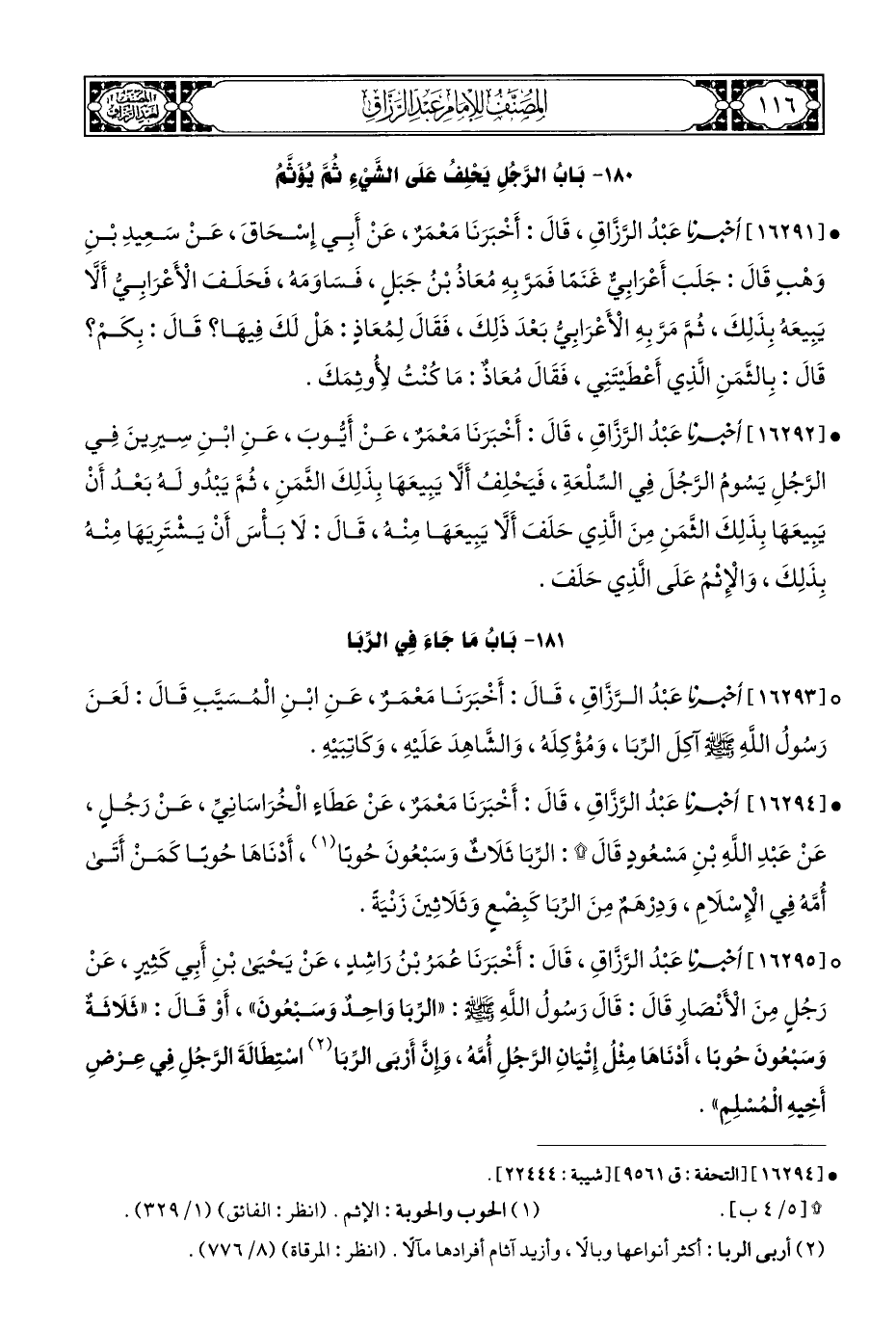 ° [١٦٢٩٣] أخبرنا عَبْدُ الرَّزَّاقِ، قَالَ: أَخْبَرَنَا مَعْمَرٌ، عَنِ ابْنِ الْمُسَيَّبِ قَالَ: لَعَنَ رَسُولُ اللهِ - صلى الله عليه وسلم - آكِلَ الرِّبَا، وَمُؤْكِلَه، وَالشَّاهِدَ عَلَيْهِ، وَكَاتِبَيْهِ.