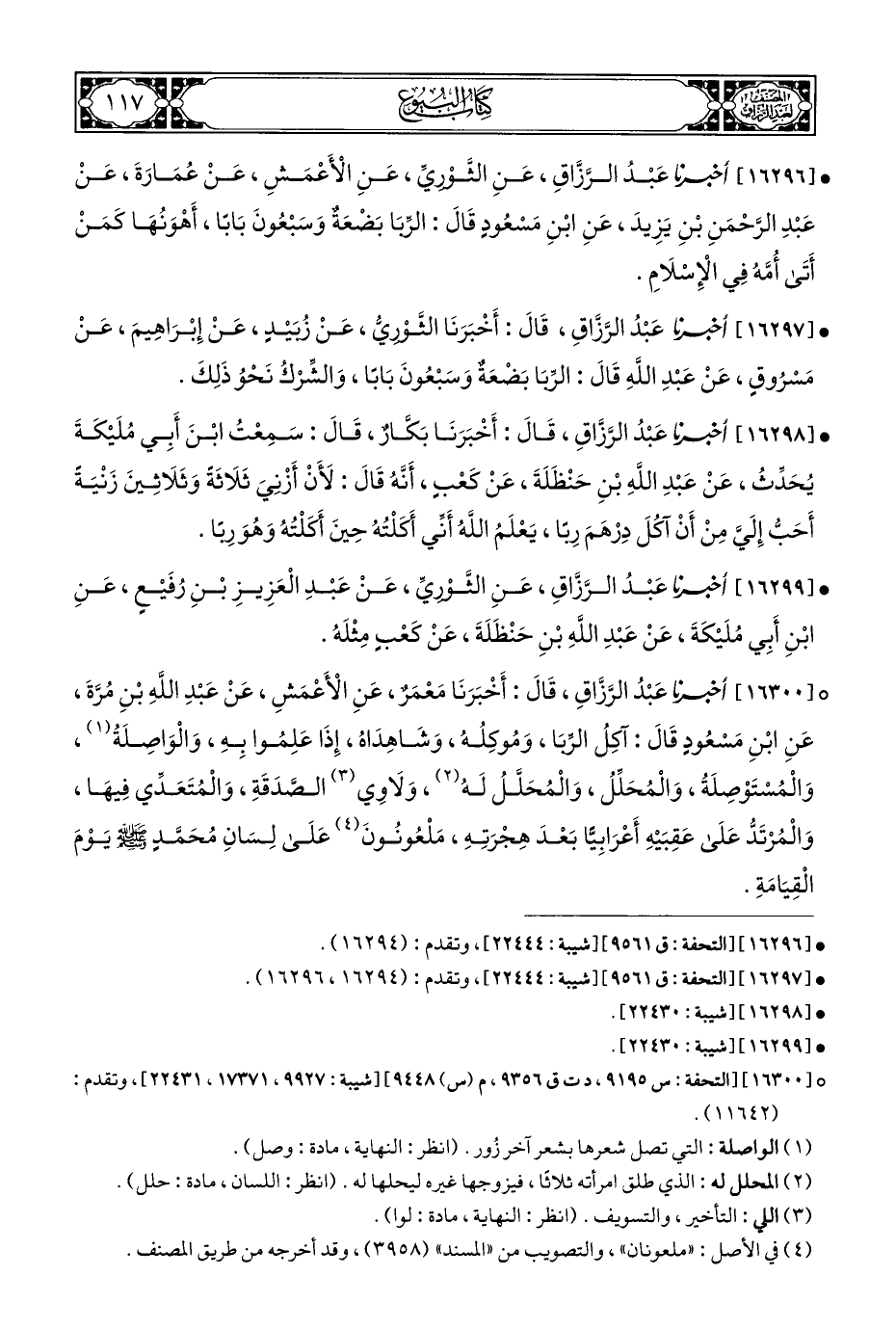 ° [١٦٣٠٠] أخبرنا عَبْدُ الرَّزَّاقِ، قَالَ: أَخْبَرَنَا مَعْمَرٌ، عَنِ الْأَعْمَشِ، عَنْ عَبْدِ اللهِ بْنِ مُرَّةَ، عَنِ ابْنِ مَسْعُودٍ قَالَ: آكِلُ الرِّبَا، وَمُوكِلُه، وَشَاهِدَاه، إِذَا عَلِمُوا بِهِ، وَالْوَاصِلَةُ (¬١)، وَالْمُسْتَوْصِلَة، وَالْمُحَلِّل، وَالْمُحَلَّلُ لَهُ (¬٢)، وَلَاوِي (¬٣) الصَّدَقَةِ، وَالْمُتَعَدِّي فِيهَا، وَالْمُرْتَدُّ عَلَى عَقِبَيْهِ أَعْرَابِيًّا بَعْدَ هِجْرَتِهِ، مَلْعُونُونَ (¬٤) عَلَى لِسَانِ مُحَمَّدٍ - صلى الله عليه وسلم - يَوْمَ الْقِيَامَةِ.