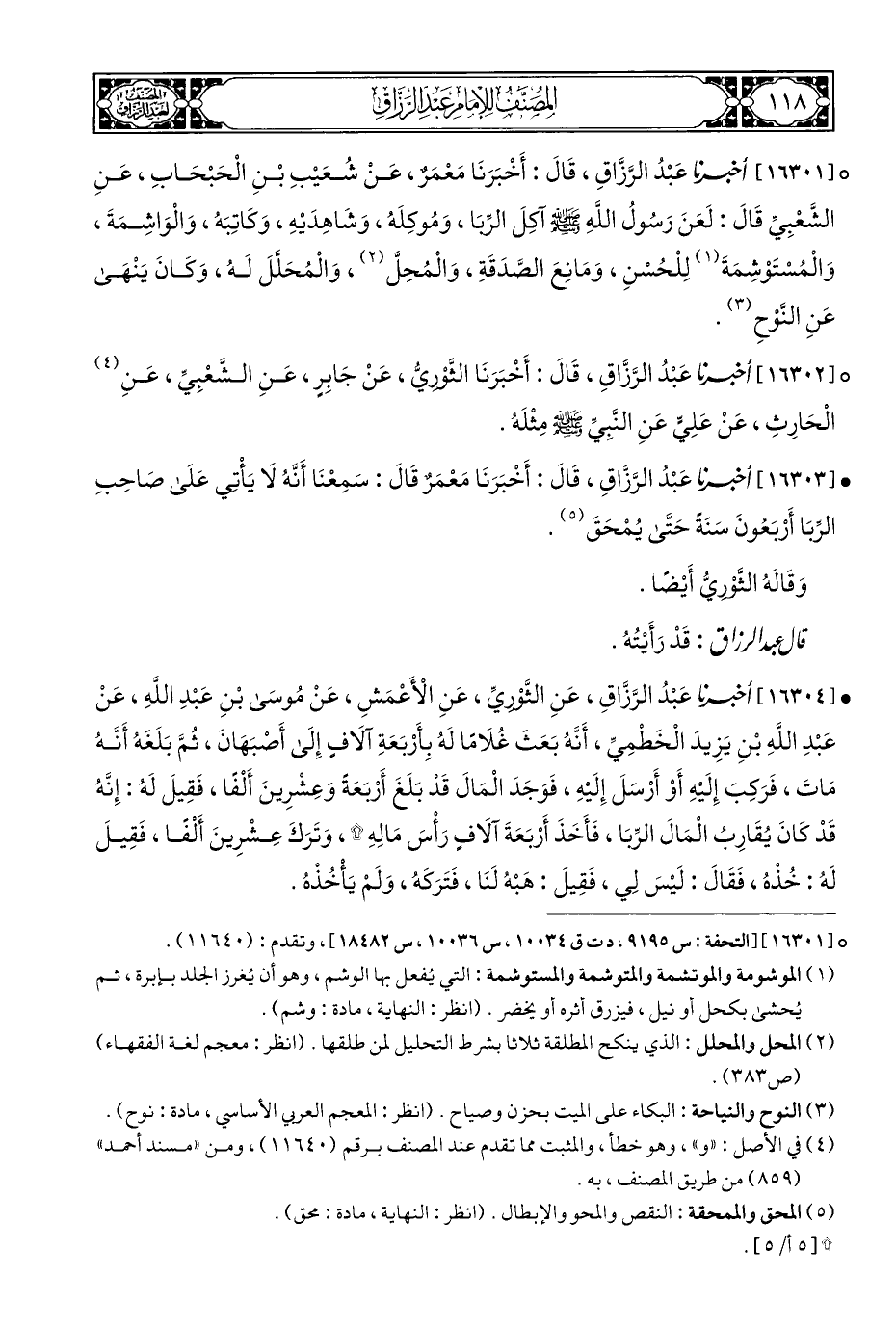 ° [١٦٣٠١] أخبرنا عَبْدُ الرَّزَّاقِ، قَالَ: أَخْبَرَنَا مَعْمَرٌ، عَنْ شُعَيْبِ بْنِ الْحَبْحَابِ، عَنِ الشَّعْبِيِّ قَالَ: لَعَنَ رَسُولُ اللهِ - صلى الله عليه وسلم - آكِلَ الرِّبَا، وَمُوكِلَه، وَشَاهِدَيْهِ، وَكَاتِبَه، وَالْوَاشِمَةَ، وَالْمُسْتَوْشِمَةَ (¬١) لِلْحُسْنِ، وَمَانِعَ الصَّدَقَةِ، وَالْمُحِلَّ (¬٢)، وَالْمُحَلَّلَ لَه، وَكَانَ يَنْهَى عَنِ النَّوْحِ (¬٣).