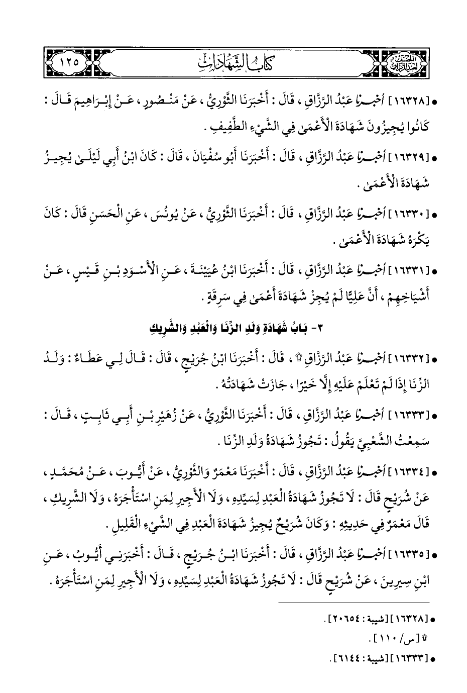 • [١٦٣٢٩] أخبرنا عَبْدُ الرَّزَّاقِ، قَالَ: أَخْبَرَنَا أَبُو سُفْيَانَ، قَالَ: كَانَ ابْنُ أَبِي لَيْلَى يُجِيزُ شهَادَةَ الْأَعْمَى.