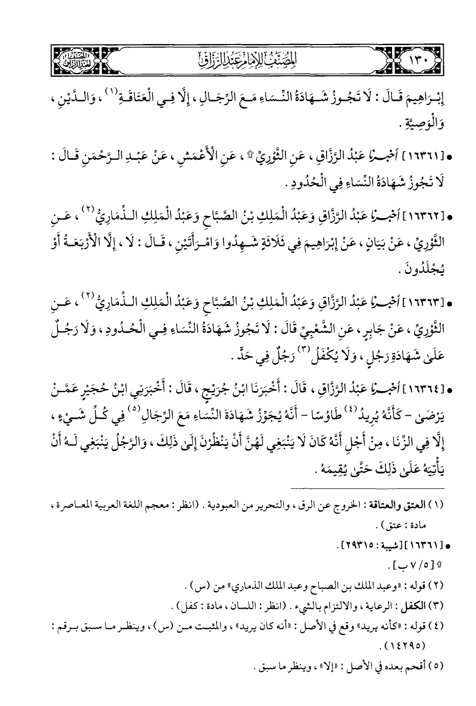 • [١٦٣٦٣] أخبرنا عَبْدُ الرَّزَّاقِ وَعَبْدُ الْمَلِكِ بْنُ الصَّبَّاحِ وَعَبْدُ الْمَلِكِ الذِّمَارِيُّ (¬٢)، عَنِ الثَّوْرِيِّ، عَنْ جَابِرٍ، عَنِ الشَّعْبِيِّ قَالَ: لَا تَجُوزُ شَهَادَةُ النِّسَاءِ فِي الْحُدُودِ، وَلَا رَجُلٌ عَلَى شَهَادَةِ رَجُلٍ، وَلَا يُكْفَلُ (¬٣) رَجُلٌ فِي حَدٍّ.