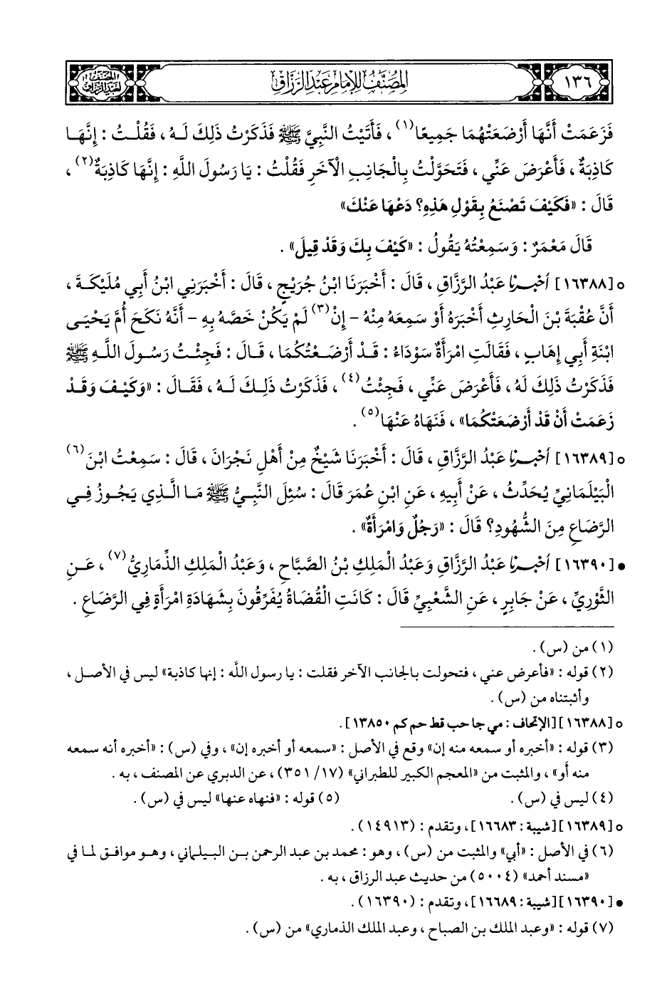 ° [١٦٣٨٨] أخبرنا عَبْدُ الرَّزَّاقِ، قَالَ: أَخْبَرَنَا ابْنُ جُرَيْجٍ، قَالَ: أَخْبَرَنِي ابْنُ أَبِي مُلَيْكَةَ، أَنَّ عُقْبَةَ بْنَ الْحَارِثِ أَخْبَرَهُ أَوْ سَمِعَهُ مِنْهُ - إِنْ (¬٣) لَمْ يَكُنْ خَصَّهُ بِهِ - أَنَّهُ نَكَحَ أُمَّ يَحْيَى ابْنَةِ أَبِي إِهَابٍ، فَقَالَتِ امْرَأَةٌ سَوْدَاءُ: قَدْ أَرْضَعْتُكُمَا، قَالَ: فَجِئْتُ رَسُولَ اللهِ - صلى الله عليه وسلم - فَذَكَرْتُ ذَلِكَ لَه، فَأَعْرَضَ عَنِّي، فَجِئْتُ (¬٤)، فَذَكَرْتُ ذَلِكَ لَه، فَقَالَ: "وَكَيْفَ وَقَدْ زَعَمَتْ أَنْ قَدْ أَرْضَعَتْكُمَا"، فَنَهَاهُ عَنْهَا (¬٥).