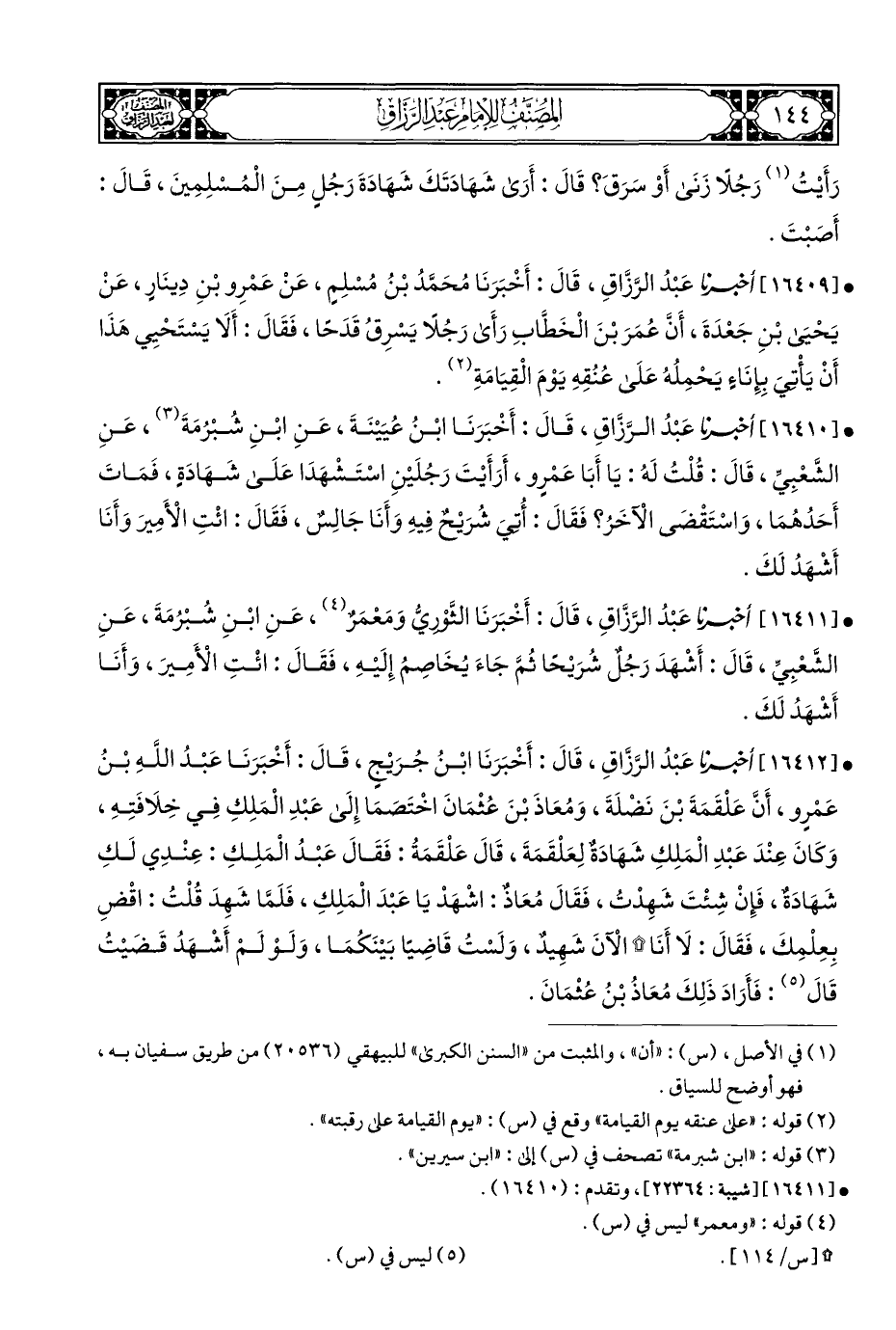 • [١٦٤١٠] أخبرنا عَبْدُ الرَّزَّاقِ، قَالَ: أَخْبَرَنَا ابْنُ عُيَيْنَةَ، عَنِ ابْنِ شُبْرُمَةَ (¬٣)، عَنِ الشَّعْبِيِّ، قَالَ: قُلْتُ لَهُ: يَا أَبَا عَمْرٍو، أَرَأَيْتَ رَجُلَيْنِ اسْتَشْهَدَا عَلَى شَهَادَةٍ، فَمَاتَ أَحَدُهُمَا، وَاسْتَقْضى الْآخَرُ؟ فَقَالَ: أُتيَ شُرَيْحٌ فِيهِ وَأَنَا جَالِسٌ، فَقَالَ: ائْتِ الْأَمِيرَ وَأَنَا أَشْهَدُ لَكَ.