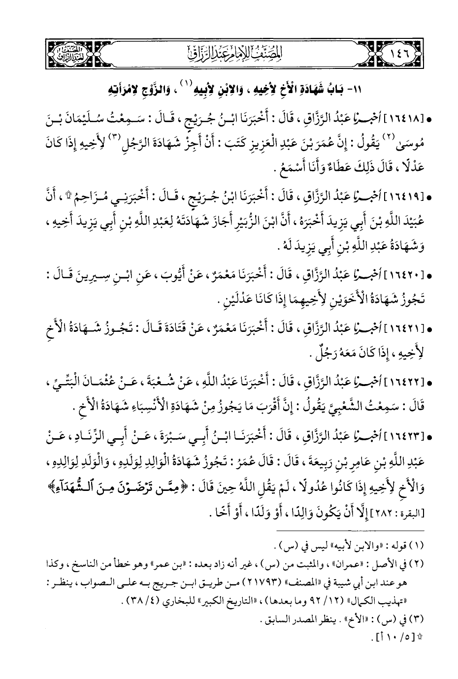 • [١٦٤٢٠] أخبرنا عَبْدُ الرَّزَّاقِ، قَالَ: أَخْبَرَنَا مَعْمَرٌ، عَنْ أَيُّوبَ، عَنِ ابْنِ سِيرِينَ قَالَ: تَجُوزُ شَهَادَةُ الْأَخوَيْنِ لِأَخِيهِمَا إِذَا كَانَا عَدْلَيْنِ.