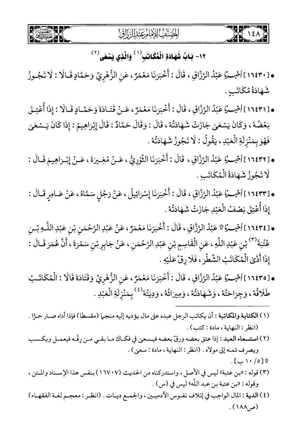 • [١٦٤٣٥] أخبرنا عَبْدُ الرَّزَّاقِ، قَالَ: أَخْبَرَنَا مَعْمَرٌ، عَنِ الزُّهْرِيِّ وَقَتَادَةَ قَالَا: الْمُكَاتَبُ طَلَاقُه، وَجِرَاحَتُه، وَشَهَادَتُه، وَمِيرَاثُه، وَدِيَتُهُ (¬٤) بِمَنْزِلَةِ الْعَبْدِ.