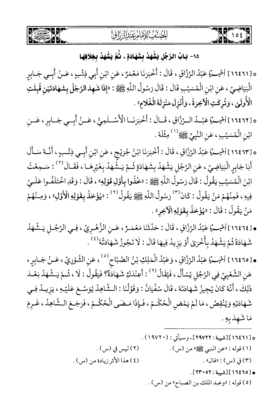 ° [١٦٤٦٣] أخبرنا عَبْدُ الرَّزَّاقِ، قَالَ: أَخْبَرَنَا ابْنُ جُرَيْجٍ، عَنِ ابْنِ أَبِي ذِئْبٍ، أَنَّهُ سَأَلَ أَبَا جَابِرٍ الْبَيَاضِيِّ، عَنِ الرَّجُلِ يَشْهَدُ بِشَهَادَةٍ ثُمَّ يَشْهَدُ بِغَيْرِهَا، فَقَالَ (¬٢): سَمِعْتُ ابْنَ الْمُسَيَّبِ يَقُولُ: قَالَ رَسُولُ اللَّهِ - صلى الله عليه وسلم -: "خُذُوا بِأَوَّلِ قَوْلِهِ"، قَالَ: وَقَدِ اخْتَلَفُوا عَلَيَّ فِيهِ، فَمِنْهُمْ مَنْ يَقُولُ: كَانَ (¬٣) رَسُولُ اللَّهِ - صلى الله عليه وسلم - يَقُولُ (٢): "يُؤْخَذُ بِقَوْلِهِ الْأَوَّلِ"، وَمِنْهُمْ مَنْ يَقُولُ: قَالَ: "يُؤْخَذُ بِقَوْلِهِ الْآخِرِ".