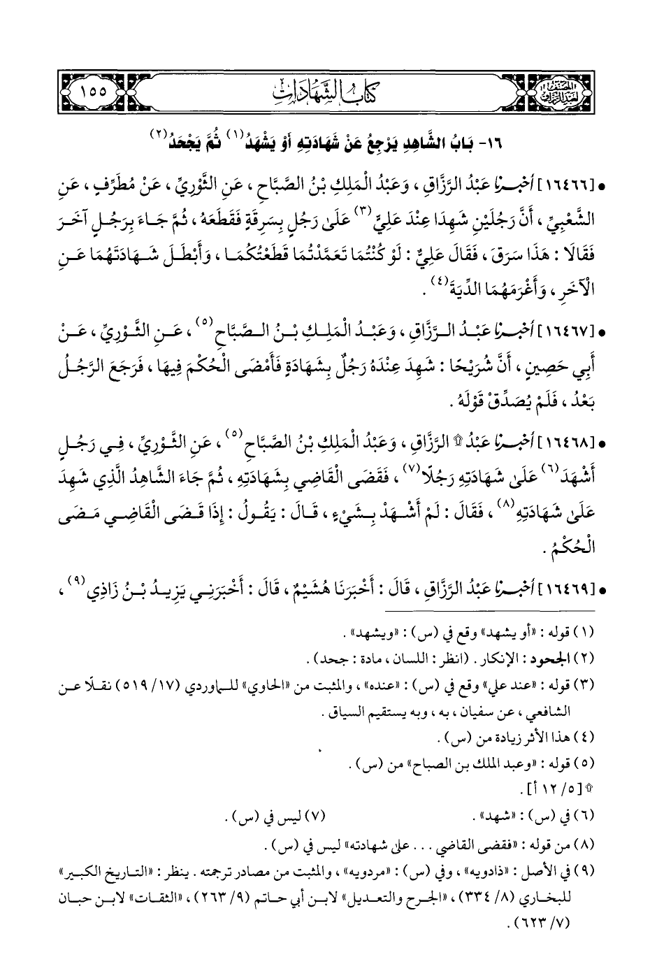 • [١٦٤٦٨] أخبرنا عَبْدُ * الرَّزَّاقِ، وَعَبْدُ الْمَلِكِ بْنُ الصَّبَّاحِ (¬٥)، عَنِ الثَّوْريِّ، فِي رَجُلٍ أَشْهَدَ (¬٦) عَلَى شَهَادَتِهِ رَجُلًا (¬٧)، فَقَضَى الْقَاضِي بِشَهَادَتِهِ، ثُمَّ جَاءَ الشَاهِدُ الَّذِي شَهِدَ عَلَى شَهَادَتِهِ (¬٨)، فَقَالَ: لَمْ أَشْهَدْ بِشَيءٍ، قَالَ: يَقُولُ: إِذَا قَضَى الْقَاضِي مَضَى الْحُكْمُ.