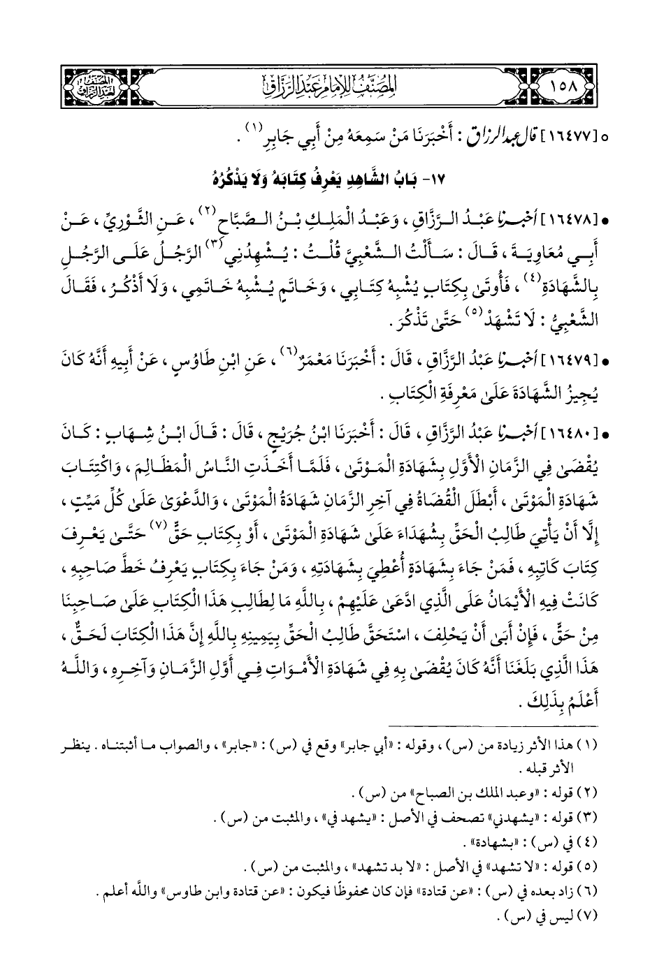 ° [١٦٤٧٧] قال عبد الرزاق: أَخْبَرَنَا مَنْ سَمِعَهُ مِنْ أَبِي جَابِرِ (¬١).