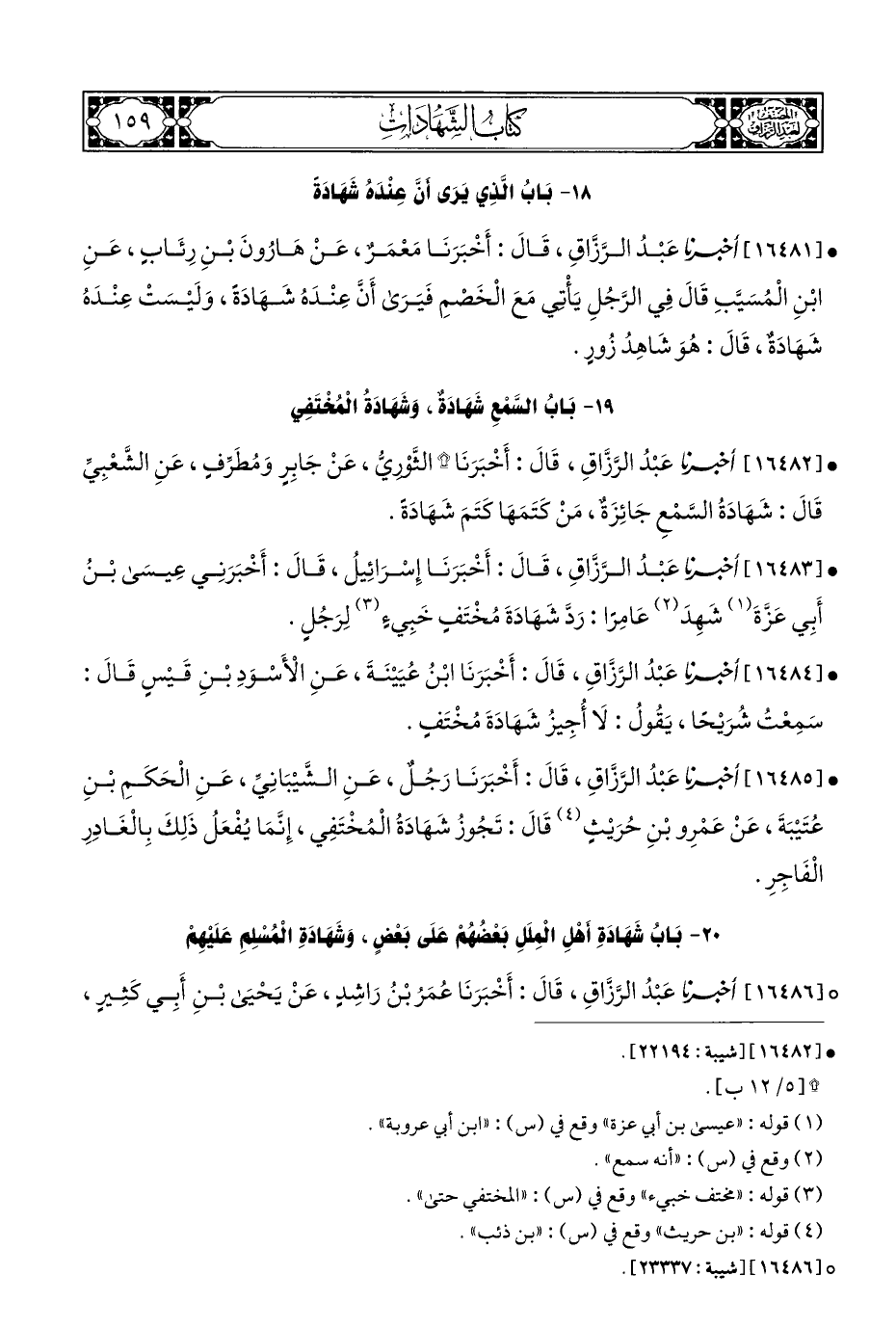 • [١٦٤٨٣] أخبرنا عَبْدُ الرَّزَّاقِ، قَال: أَخْبَرَنَا إِسْرَائِيل، قَالَ: أَخْبَرَنِي عِيسَى بْنُ أبِي عَزَّةَ (¬١) شهِد (¬٢) عَامِرَا: رَدَّ شَهَادَةَ مُختفٍ خبِيءٍ (¬٣) لِرَجُلٍ.