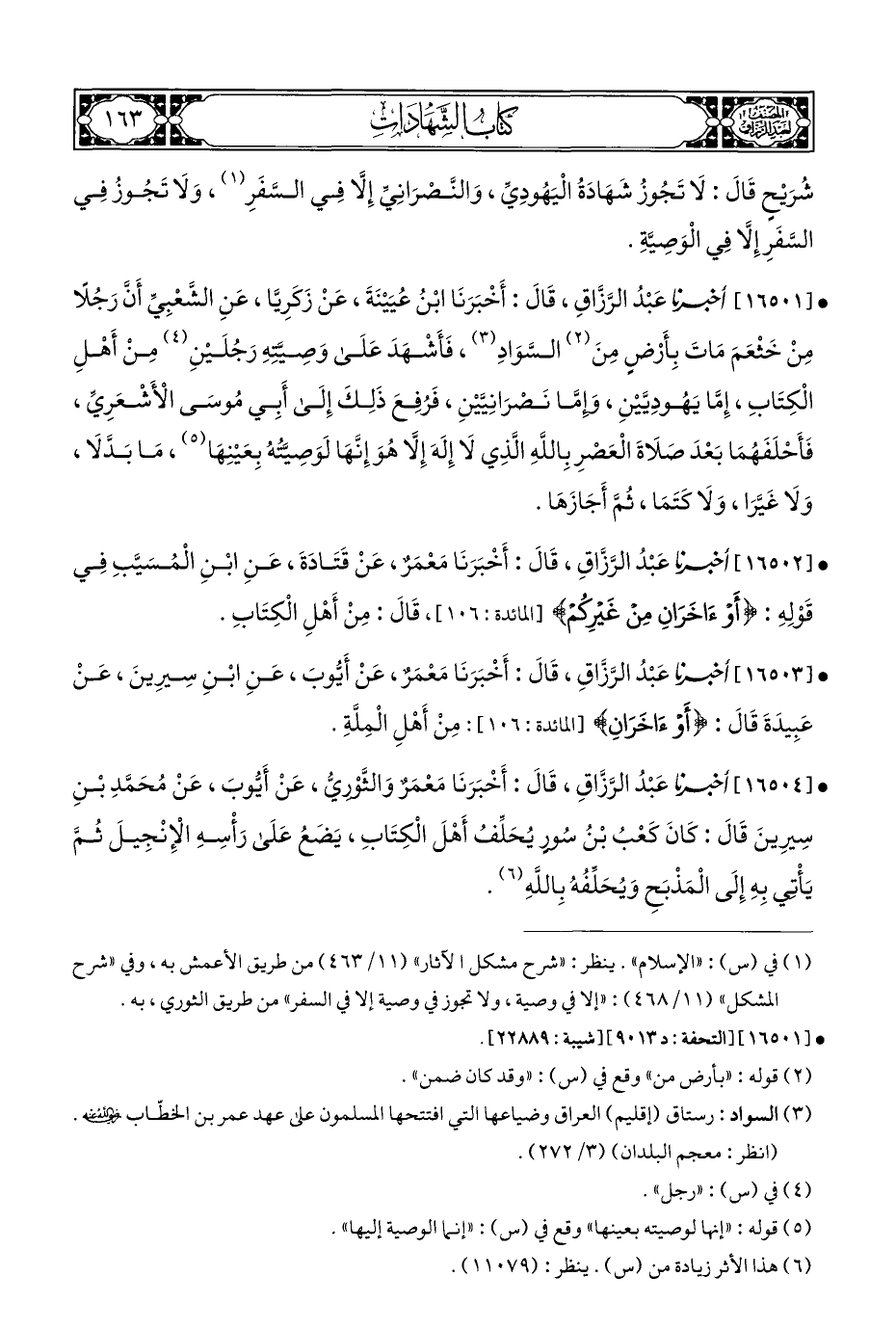 • [١٦٥٠١] أخبرنا عَبْدُ الرَّزَّاقِ، قَالَ: أَخْبَرَنَا ابْنُ عُيَيْنَةَ، عَنْ زَكَرِيَّا، عَنِ الشَّعْبِيِّ أَنَّ رَجُلًا مِنْ خَثْعَمَ مَاتَ بِأَرْضٍ مِنَ (¬٢) السَّوَادِ (¬٣)، فَأَشْهَدَ عَلَى وَصِيَّتِهِ رَجُلَيْنِ (¬٤) مِنْ أَهْلِ الْكِتَابِ، إِمَّا يَهُودِيَّيْنِ، وإِمَّا نَصْرَانِييْنِ، فَرُفِعَ ذَلِكَ إِلَى أَبِي مُوسَى الْأَشْعَرِيِّ، فَأَحْلَفَهُمَا بَعْدَ صَلَاةَ الْعَصْرِ بِاللَّهِ الَّذِي لَا إِلَهَ إِلَّا هُوَ إِنَّهَا لَوَصِيَّتُهُ بِعَيْنِهَا (¬٥)، مَا بَدَّلَا، وَلَا غَيَّرَا، وَلَا كَتَمَا، ثُمَّ أَجَازَهَا.