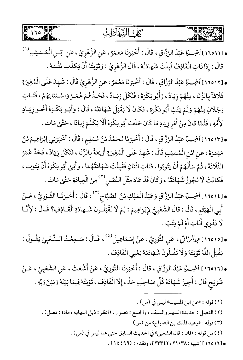 • [١٦٥١٤] أخبرنا عَبْدُ الرَّزَّاقِ وَعَبْدُ الْمَلِكِ بْنُ الصَّبَّاحِ (¬٣)، قَالَ: أَخْبَرَنَا الثَّوْريُّ، عَنْ أَبِي الْهَيْثَمِ، قَالَ: قَالَ الشَّعْبِيُّ لإِبْرَاهِيمَ: لِمَ لَا تَقْبَلُونَ شَهَادَةِ الْقَاذِفِ؟ قَالَ: لِأَنَّا لَا نَدْرِي أَتَابَ أَمْ لَمْ يَتُبْ.