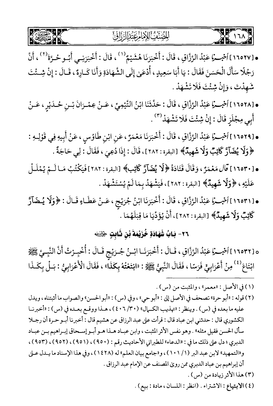 (¬٢) قوله: "أبو حرة" تصحف في الأصل إلى: "أبو حي"، وفي (س): "أبو الحسن" والصواب ما أثبتناه، ويدل عليه ما بعده في (س). وينظر: "تهذيب الكمال" (٣٠/ ٤٠٦)، هذا ووقع بعده في (س): "أخبرنا الكشوري قال: حدثني ابن عباد قال: قرأت على عبد الرزاق عن هشيم قال: أخبرنا أبو حرة أن رجلا سأل الحسن فقيل مثله". وهو نفس الأثر المثبت، وابن عباد هذا هو أبو إسحاق إبراهيم بن عباد الدبري؛ دل على ذلك ما في: "الدعاء" للطبراني الأحاديث رقم: (٩٥٠)، (٩٥١)، (٩٥٢)، (٩٥٣)، و"التمهيد" لابن عبد البر (١/ ١٠١)، و"جامع بيان العلم " له (١٤٢٨)، وفي هذا الإسناد ما يدل على أن إبراهيم بن عباد الدبري ممن روى المصنف عن الإمام عبد الرزاق.
