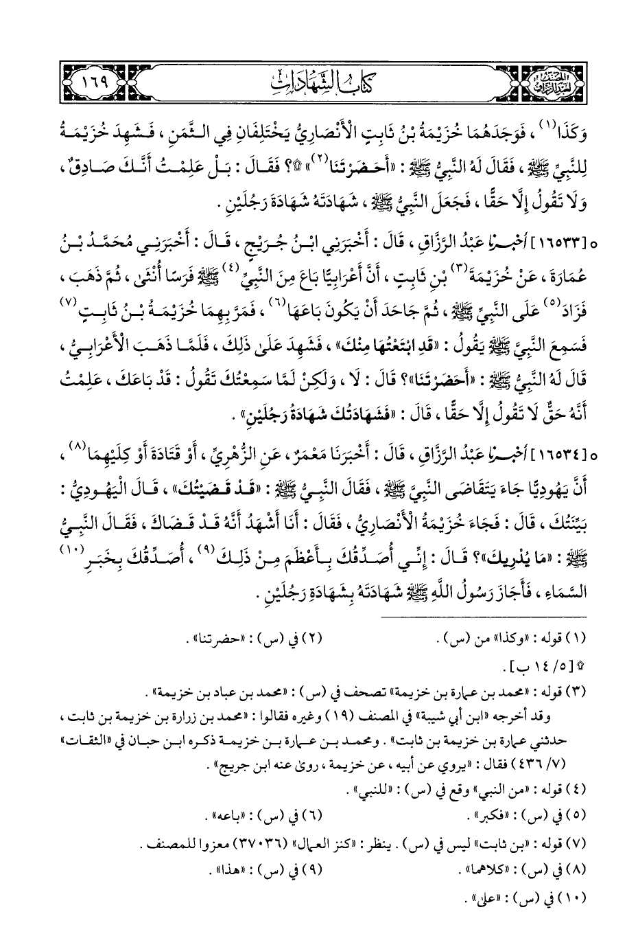 ° [١٦٥٣٤] أخبرنا عَبْدُ الرَّزَّاقِ، قَالَ: أَخْبَرَنَا مَعْمَرٌ، عَنِ الزُّهْرِيِّ، أَوْ قَتَادَةَ أَوْ كِلَيْهِمَا (¬٨)، أَنَّ يَهُودِيًّا جَاءَ يَتَقَاضَى النَّبِيَّ - صلى الله عليه وسلم -، فَقَالَ النَّبِيُّ - صلى الله عليه وسلم -: "قَدْ قَضَيْتُكَ"، قَالَ الْيَهُودِيُّ: بَيِّنَتُكَ، قَالَ: فَجَاءَ خُزَيْمَةُ الْأَنْصَارِيّ، فَقَالَ: أَنَا أَشْهَدُ أَنَّهُ قَدْ قَضَاكَ، فَقَالَ النَّبِيُّ - صلى الله عليه وسلم -: "مَا يُدْرِيكَ "؟ قَالَ: إِنِّي أُصَدِّقُكَ بِأَعْظَمَ مِنْ ذَلِكَ (¬٩)، أُصَدِّقُكَ بِخَبَرِ (¬١٠) السَّمَاءِ، فَأَجَازَ رَسُولُ اللَّهِ - صلى الله عليه وسلم - شَهَادَتَهُ بِشَهَادَةِ رَجُلَيْنِ.