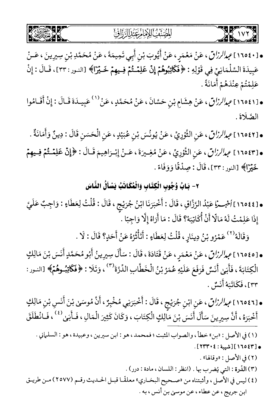 • [١٦٥٤٥] عبد الرزاق، عَنْ مَعْمَرٍ، عَنْ قَتَادَةَ، قَالَ: سَأَلَ سِيرِينُ أَبُو مُحَمَّدٍ أَنَسَ بْنَ مَالِكِ الْكِتَابَةَ، فَأَبَى أَنَسٌ فَرَفَعَ عَلَيْهِ عُمَرُ بْنُ الْخَطَّابِ الدِّرَّةَ (¬٣)، وَتَلَا: {فَكَاتِبُوهُمْ} [النور: ٣٣]، فَكَاتَبَهُ أَنَسٌ.
