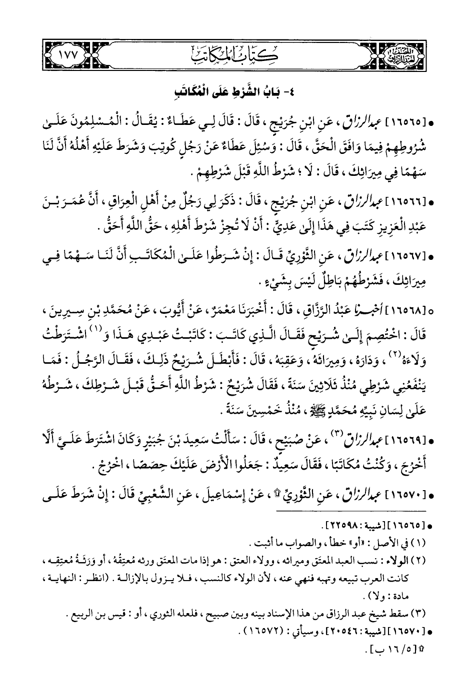 ° [١٦٥٦٨] أخبرنا عَبْدُ الرَّزَّاقِ، قَالَ: أَخْبَرَنَا مَعْمَرٌ، عَنْ أَيُّوبَ، عَنْ مُحَمَّدِ بْنِ سِيرِينَ، قَالَ: اخْتُصِمَ إِلَى شُرَيْحٍ فَقَالَ الَّذِي كَاتَبَ: كَاتَبْتُ عَبْدِي هَذَا وَ (¬١) اشْتَرَطْتُ وَلَاءَهُ (¬٢)، وَدَارَه، وَمِيرَاثَه، وَعَقِبَه، قَالَ: فَأَبْطَلَ شُرَيْحٌ ذَلِكَ، فَقَالَ الرَّجُلُ: فَمَا يَنْفَعُنِي شَرْطِي مُنْذُ ثَلَاثِينَ سَنَةً، فَقَالَ شُرَيْحٌ: شَرْطُ اللَّهِ أَحَقُّ قَبْلَ شَرْطِكَ، شَرْطُهُ عَلَى لِسَانِ نَبِيِّهِ مُحَمَّدٍ - صلى الله عليه وسلم -، مُنْذُ خَمْسِينَ سَنَةً.