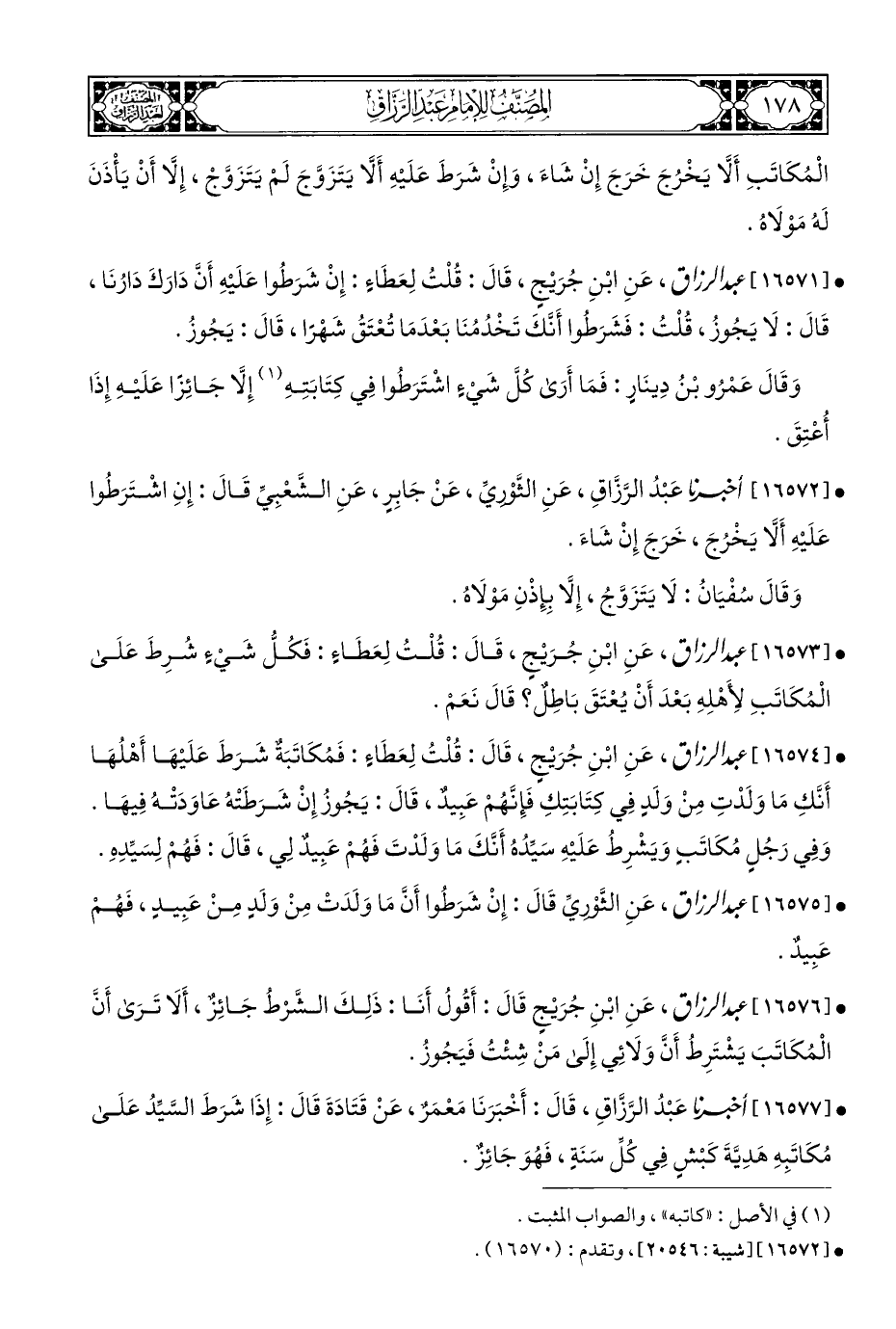 • [١٦٥٧٦] عبد الرزاق، عَنِ ابْنِ جُرَيْجٍ قَالَ: أَقُولُ أَنَا: ذَلِكَ الشَّرْطُ جَائِزٌ، أَلَا تَرَى أَنَّ الْمُكَاتَبَ يَشْتَرِطُ أَنَّ وَلَائِي إِلَى مَنْ شِئْتُ فَيَجُوزُ.