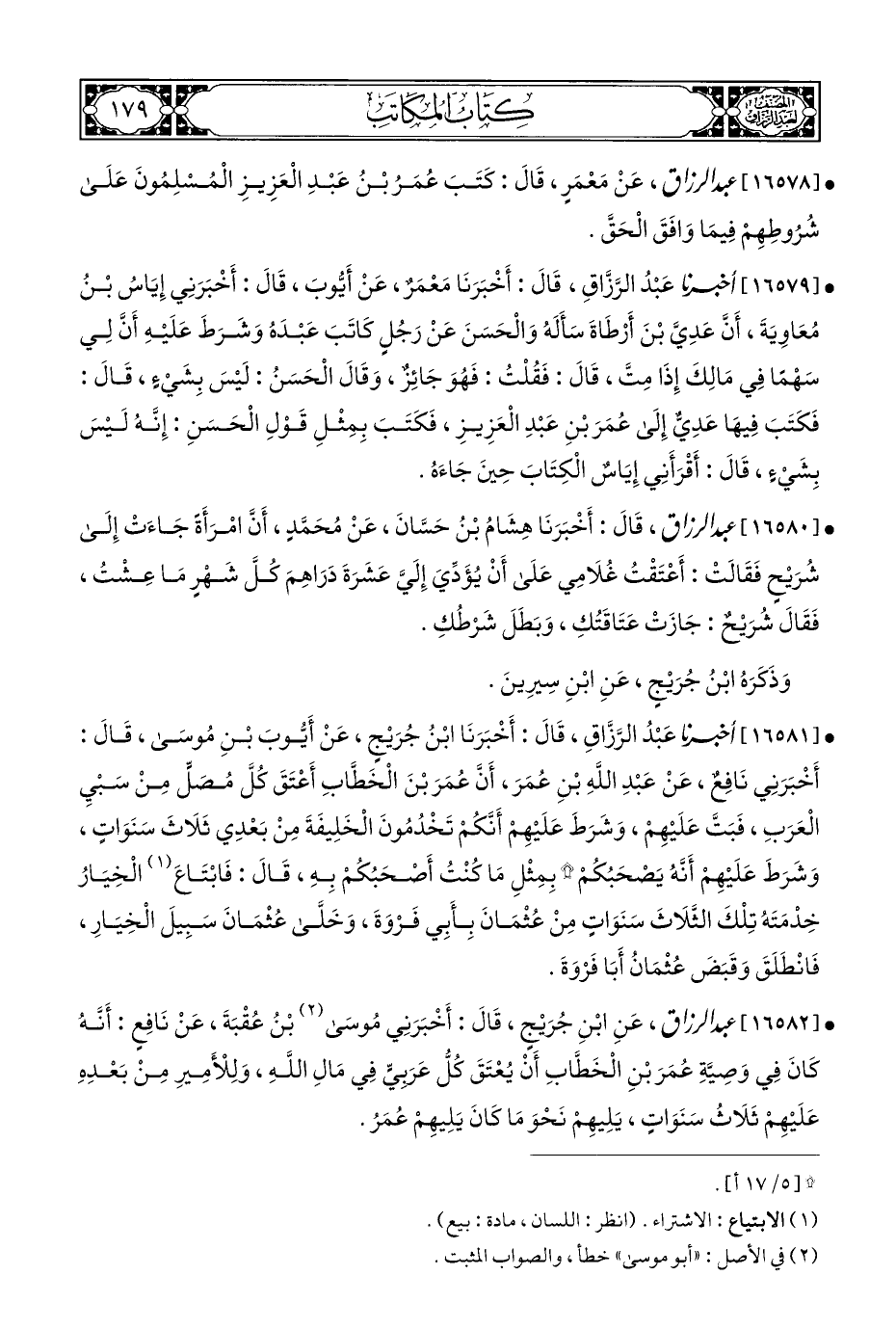 • [١٦٥٨١] أخبرنا عَبْدُ الرَّزَّاقِ، قَالَ: أَخْبَرَنَا ابْنُ جُرَيْجٍ، عَنْ أَيُّوبَ بْنِ مُوسَى، قَالَ: أَخْبَرَنِي نَافِعٌ، عَنْ عَبْدِ اللَّهِ بْنِ عُمَرَ، أَنَّ عُمَرَ بْنَ الْخَطَّابِ أَعْتَقَ كُلَّ مُصَلٍّ مِنْ سَبْيِ الْعَرَبِ، فَبَتَّ عَلَيْهِمْ، وَشَرَطَ عَلَيْهِمْ أَنَّكُمْ تَخْدُمُونَ الْخَلِيفَةَ مِنْ بَعْدِي ثَلَاثَ سَنَوَاتٍ، وَشَرَطَ عَلَيْهِمْ أَنَّهُ يَصْحَبُكُمْ * بِمِثْلِ مَا كُنْتُ أَصْحَبُكُمْ بِهِ، قَالَ: فَابْتَاعَ (¬١) الْخِيَارُ خِدْمَتَهُ تِلْكَ الثَّلَاثَ سَنَوَاتٍ مِنْ عُثْمَانَ بِأَبِي فَرْوَةَ، وَخَلَّى عُثْمَانَ سَبِيلَ الْخِيَارِ، فَانْطَلَقَ وَقَبَضَ عُثْمَانُ أَبَا فَرْوَةَ.