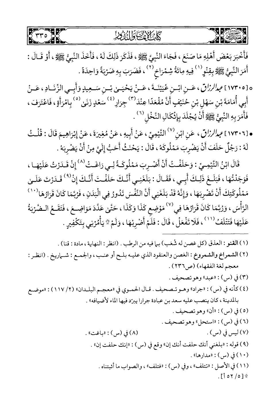° [١٧٣٠٥] عبد الرزاق، عَنِ ابْنِ عُيَيْنَةَ، عَنْ يَحْيَى بْنِ سَعِيدٍ وَأَبِي الزِّنَادِ، عَنْ أَبِي أُمَامَةَ بْنِ سَهْلِ بْنِ حُنَيْفٍ أَنَّ مُقْعَدًا عِنْدَ (¬٣) جِرَارِ (¬٤) سَعْدٍ زَنَى (¬٥) بِامْرَأَةٍ، فَاعْتَرَفَ، فَأَمَرَ بِهِ النَّبِيُّ - صلى الله عليه وسلم - أَنْ يُجْلَدَ بِإِثْكَالِ النَّخْلِ (¬٦).
