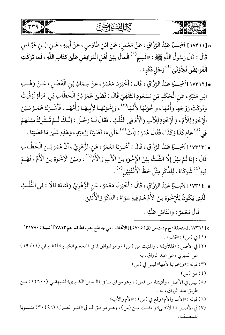 • [١٧٣١٢] أخبرنا عَبْدُ الرَّزَّاقِ، قَالَ: أَخْبَرَنَا مَعْمَرٌ، عَنْ سِمَاكِ بْنِ الْفَضْلِ، عَنْ وَهْبِ بْنِ مُنَبِّهٍ، عَنِ الْحَكَمِ بْنِ مَسْعُودٍ الثَّقَفِيِّ قَالَ: قَضَى عُمَرُ بْنُ الْخَطَّابِ فِي امْرَأَةٍ تُوُفِّيَتْ وَتَرَكَتْ زَوْجَهَا وَأُمَّهَا، وإخْوَتَهَا لِأُمِّهَا (¬٣)، وَإِخْوَتَهَا لِأَبِيهَا وَأُمِّهَا، فَأَشْرَكَ عُمَرُ بَيْنَ الْإِخْوَةِ لِلْأُمِّ، وَالْإِخْوَةِ لِلْأَبِ وَالْأُمِّ فِي الثُّلُثِ، فَقَالَ لَهُ رَجُلٌ: إِنَّكَ لَمْ تُشْرِكْ بَيْنَهُمْ في (¬٤) عَام كَذَا وَكَذَا، فَقَالَ عُمَرُ: تِلْكَ (¬٥) عَلَى مَا قَضَيْنَا يَوْمَئِذٍ، وَهَذِهِ عَلَى مَا قَضَيْنَا.