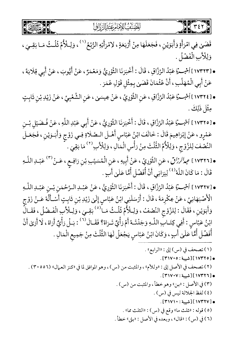 • [١٧٣٢٧] أخبرنا عَبْدُ الرَّزَّاقِ، قَالَ: أَخْبَرَنَا الثَّوْريُّ، عَنْ عَبْدِ الرَّحْمَنِ بْنِ عَبْدِ اللَّهِ الْأَصْبَهَانِيِّ، عَنْ عِكْرِمَةَ، قَالَ: أَرْسَلَنِي ابْنُ عَبَّاسٍ إِلَى زَيْدِ بْنِ ثَابِتٍ أَسْأَلُهُ عَنْ زَوْجٍ وَأَبَوَيْنِ، فَقَالَ: لِلزَّوْجِ النِّصْف، وَلِلْأُمِّ ثُلُثُ مَا (¬٥) بَقِيَ، وَلِلْأَبِ الْفَضْل، فَقَالَ ابْنُ عَبَّاسٍ: أَفِي كِتَابِ اللَّهِ وَجَدْتَهُ أَمْ رَأْيٌ تَرَاهُ؟ فَقَالَ (¬٦): بَلْ رَأْيٌ أَرَاه، لَا أَرَى أَنْ أُفَضِّلَ أُمًّا عَلَى أَبٍ، وَكَانَ ابْنُ عَبَّاسٍ يَجْعَلُ لَهَا الثُّلُثَ مِنْ جَمِيعِ الْمَالِ.