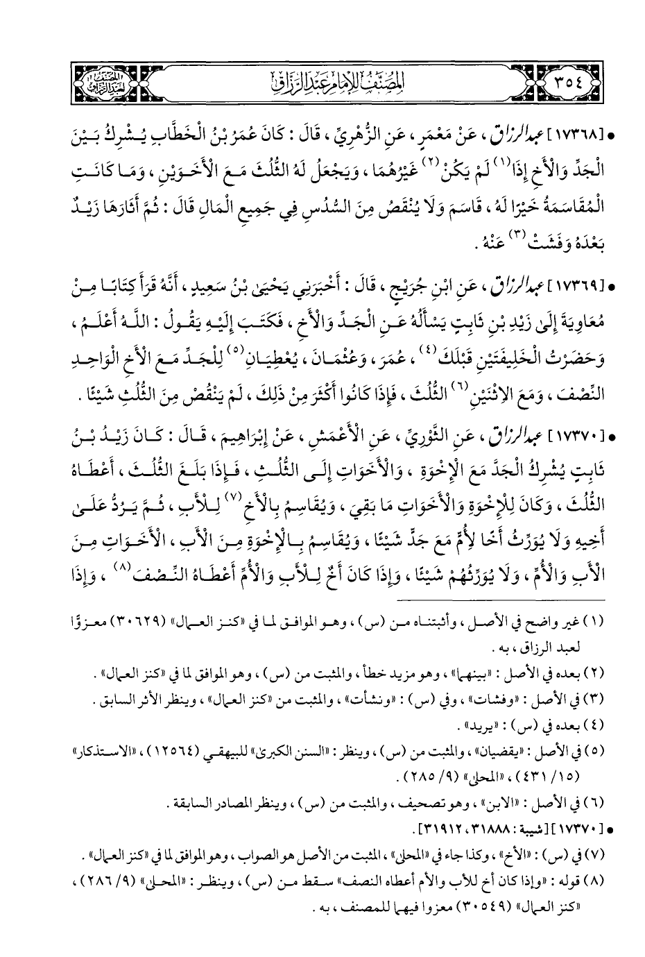 • [١٧٣٦٩] عبد الرزاق، عَنِ ابْنِ جُرَيْجٍ، قَالَ: أَخْبَرَنِي يَحْيَى بْنُ سَعِيدٍ، أَنَّهُ قَرَأَ كِتَابًا مِنْ مُعَاوِيَةَ إِلَى زَيْدِ بْنِ ثَابِتٍ يَسْأَلُهُ عَنِ الْجَدِّ وَالْأَخِ، فَكَتَبَ إِلَيْهِ يَقُولُ: اللَّهُ أَعْلَم، وَحَضَرْتُ الْخَلِيفَتَيْنِ قَبْلَكَ (¬٤)، عُمَرَ، وَعُثْمَانَ، يُعْطِيَانِ (¬٥) لِلْجَدِّ مَعَ الْأَخِ الْوَاحِدِ النِّصْفَ، وَمَعَ الاِثْنَيْنِ (¬٦) الثُّلُثَ، فَإِذَا كَانُوا أَكْثَرَ مِنْ ذَلِكَ، لَمْ يَنْقُصْ مِنَ الثُّلُثِ شَيْئًا.