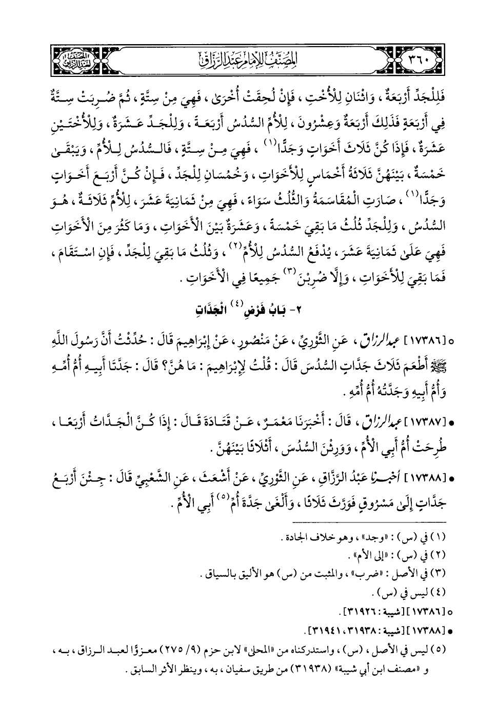 ° [١٧٣٨٦] عبد الرزاق، عَنِ الثَّوْريِّ، عَنْ مَنْصُورٍ، عَنْ إِبْرَاهِيمَ قَالَ: حُدِّثْتُ أَنَّ رَسُولَ اللهِ - صلى الله عليه وسلم - أَطْعَمَ ثَلَاثَ جَدَّاتٍ السُّدُسَ قَالَ: قُلْتُ لإِبْرَاهِيمَ: مَا هُنَّ؟ قَالَ: جَدَّتَا أَبِيهِ أُمُّ أُمِّهِ وَأُمُّ أَبِيهِ وَجَدَّتُهُ أُمُّ أُمِّهِ.