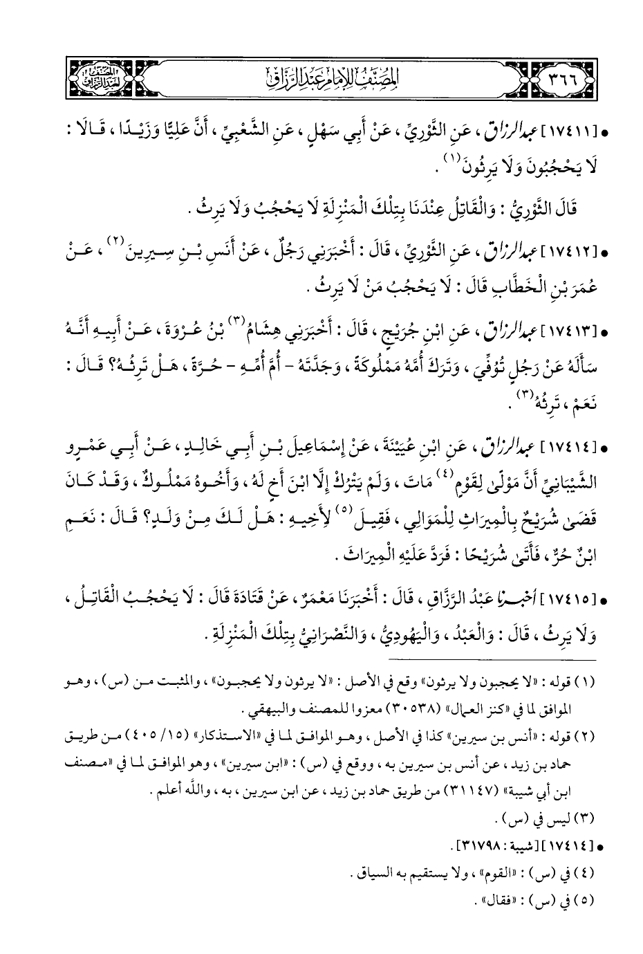 • [١٧٤١٥] أَخْبَرَنَا عَبْدُ الرَّزَّاقِ، قَالَ: أَخْبَرَنَا مَعْمَرٌ، عَنْ قَتَادَةَ قَالَ: لَا يَحْجُبُ الْقَاتِل، وَلَا يَرِث، قَالَ: وَالْعَبْد، وَالْيَهُودِيُّ، وَالنَّصْرَانِيُّ بِتِلْكَ الْمَنْزِلَةِ.