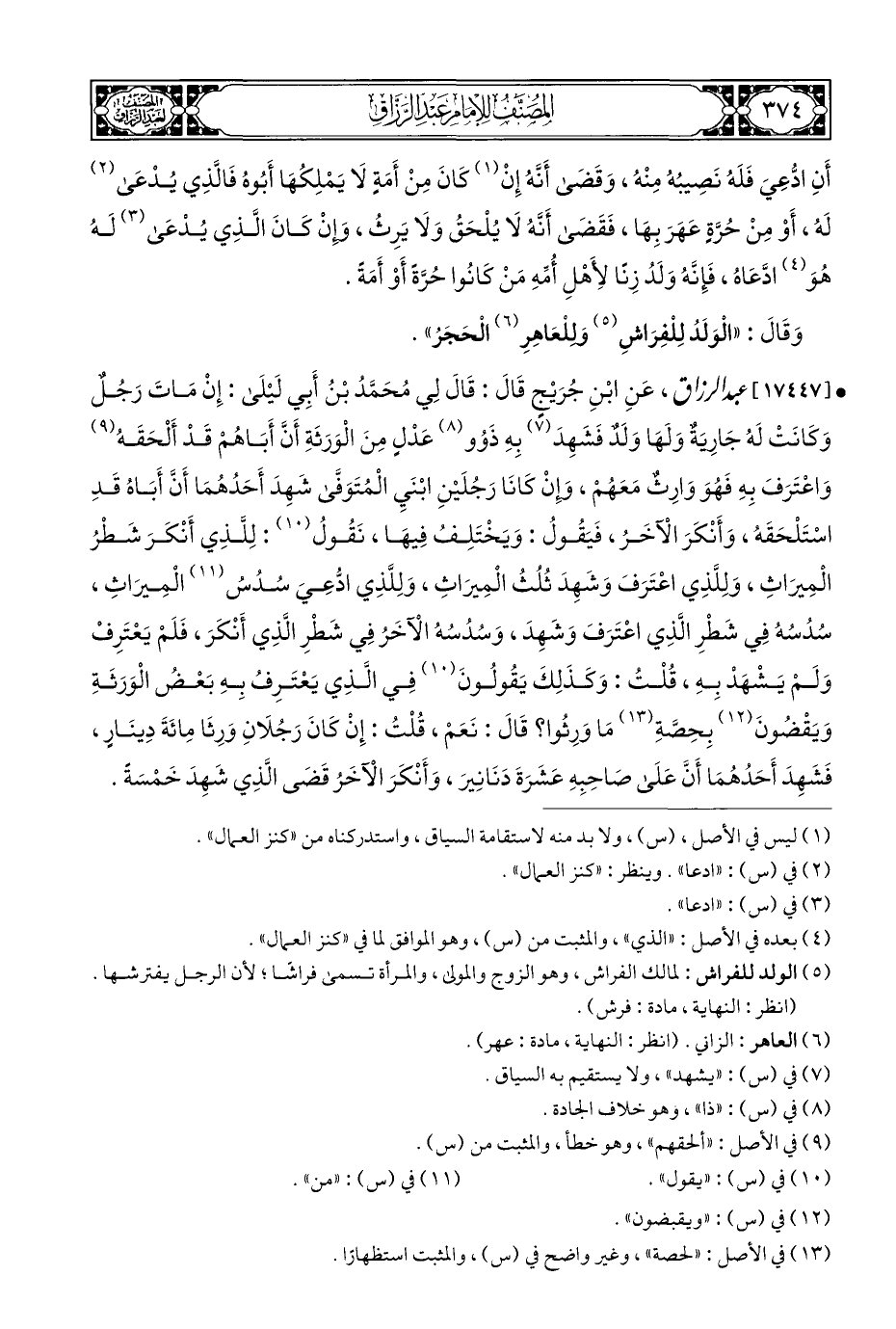 • [١٧٤٤٧] عبد الرزاق، عَنِ ابْنِ جُرَيْجٍ قَالَ: قَالَ لِي مُحَمَّدُ بْنُ أَبِي لَيْلَى: إِنْ مَاتَ رَجُلٌ وَكَانَتْ لَهُ جَارِيَةٌ وَلَهَا وَلَدٌ فَشَهِدَ (¬٧) بِهِ ذَوُو (¬٨) عَدْلٍ مِنَ الْوَرَثَةِ أَنَّ أَبَاهُمْ قَدْ أَلْحَقَهُ (¬٩) وَاعْتَرَفَ بِهِ فَهُوَ وَارِثٌ مَعَهُمْ، وإِنْ كَانَا رَجُلَيْنِ ابْنَيِ الْمُتَوَفَّى شَهِدَ أَحَدُهمَا أَنَّ أَبَاهُ قَدِ اسْتَلْحَقَه، وَأَنْكَرَ الْآخَر، فَيَقُولُ: وَيَخْتَلِفُ فِيهَا، نَقُولُ (¬١٠): لِلّذِي أَنْكَرَ شَطْرُ الْمِيرَاثِ، وَلِلَّذِي اعْتَرَفَ وَشَهِدَ ثُلُثُ الْمِيرَاثِ، وَلِلَّذِي ادُّعِيَ سُدُسُ (¬١١) الْمِيرَاثِ، سُدُسُه فِي شَطْرِ الَّذِي اعْتَرَفَ وَشَهِدَ، وَسُدُسُهُ الْآخَرُ فِي شَطْرِ الَّذِي أَنْكَرَ، فَلَمْ يَعْتَرِفْ وَلَمْ يَشْهَدْ بِهِ، قُلْتُ: وَكَذَلِكَ يَقُولُونَ (١٠) فِي الَّذِي يَعْتَرِفُ بِهِ بَعْضُ الْوَرَثَةِ وَيَقْضُونَ (¬١٢) بِحِصَّةِ (¬١٣) مَا وَرِثُوا؟ قَالَ: نَعَمْ، قُلْتُ: إِنْ كَانَ رَجُلَانِ وَرِثَا مِائَةَ دِينَارٍ، فَشَهِدَ أَحَدُهُمَا أَنَّ عَلَى صَاحِبِهِ عَشَرَةَ دَنَانِيرَ، وَأَنْكَرَ الآخَرُ قَضَى الَّذِي شَهِدَ خَمْسَةً.