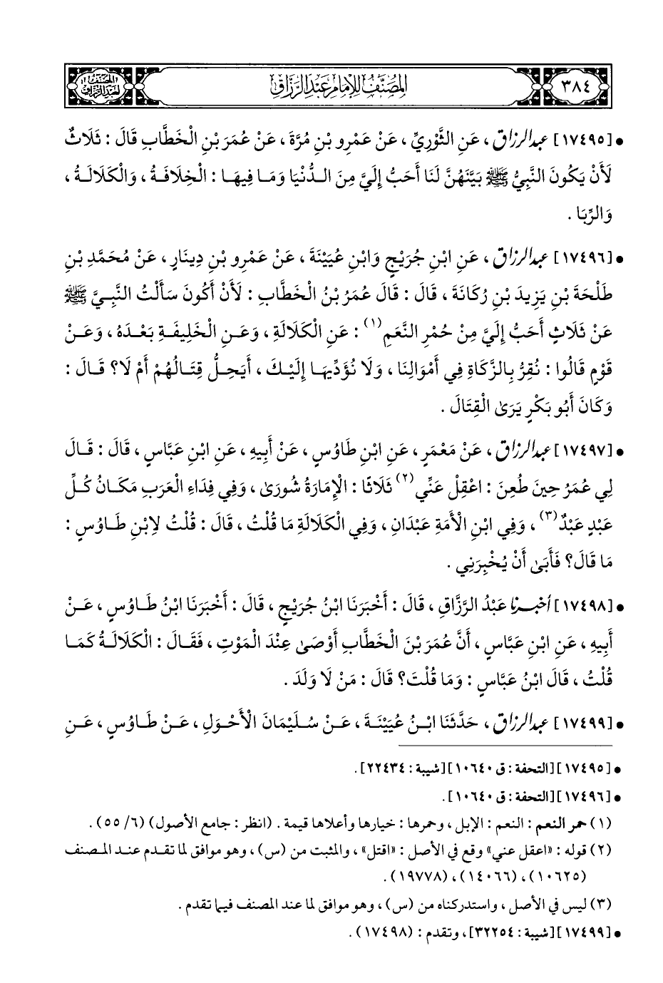 • [١٧٤٩٦] عبد الرزاق، عَنِ ابْنِ جُرَيْجٍ وَابْنِ عُيَيْنَةَ، عَنْ عَمْرِو بْنِ دِينَارٍ، عَنْ مُحَمَّدِ بْنِ طَلْحَةَ بْنِ يَزِيدَ بْنِ رُكَانَةَ، قَالَ: قَالَ عُمَرُ بْنُ الْخَطَّابِ: لأَنْ أَكُونَ سَأَلْتُ النَّبِيَّ - صلى الله عليه وسلم - عَنْ ثَلَاثٍ أَحَبُّ إِلَيَّ مِنْ حُمْرِ النَّعَمِ (¬١): عَنِ الْكَلَالَةِ، وَعَنِ الْخَلِيفَةِ بَعْدَه، وَعَنْ قَوْمٍ قَالُوا: نُقِرُّ بِالزَّكَاةِ فِي أَمْوَالِنَا، وَلَا نُؤَدِّيهَا إِلَيْكَ، أَيَحِلُّ قِتَالُهُمْ أَمْ لَا؟ قَالَ: وَكَانَ أَبُو بَكْرٍ يَرَى الْقِتَالَ.