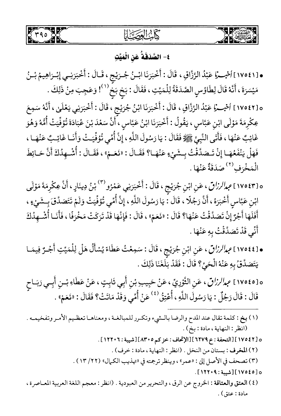 ° [١٧٥٤٣] عبد الرزاق، عَنِ ابْنِ جُرَيْجٍ، قَالَ: أَخْبَرَنِي عَمْرُو (¬٣) بْنُ دِينَارٍ، أَنَّ عِكْرِمَةَ مَوْلَى ابْنِ عَبَّاسٍ أَخْبَرَه، أَنَّ رَجُلًا، قَالَ: يَا رَسُولَ اللهِ، إِنَّ أُمِّي تُوُفِّيَتْ وَلَمْ تَتَصَدَّقَ بِشَيْءٍ، أَفَلَهَا أَجْرٌ إِنْ تَصدَّقْتُ عَنْهَا؟ قَالَ: "نَعَمْ"، قَالَ: فَإِنَّهَا قَدْ تَرَكَتْ مَخْرَفًا، فَأَنَا أُشْهِدُكَ أَنِّي قَدْ تَصَدَّقْتُ بِهِ عَنْهَا.