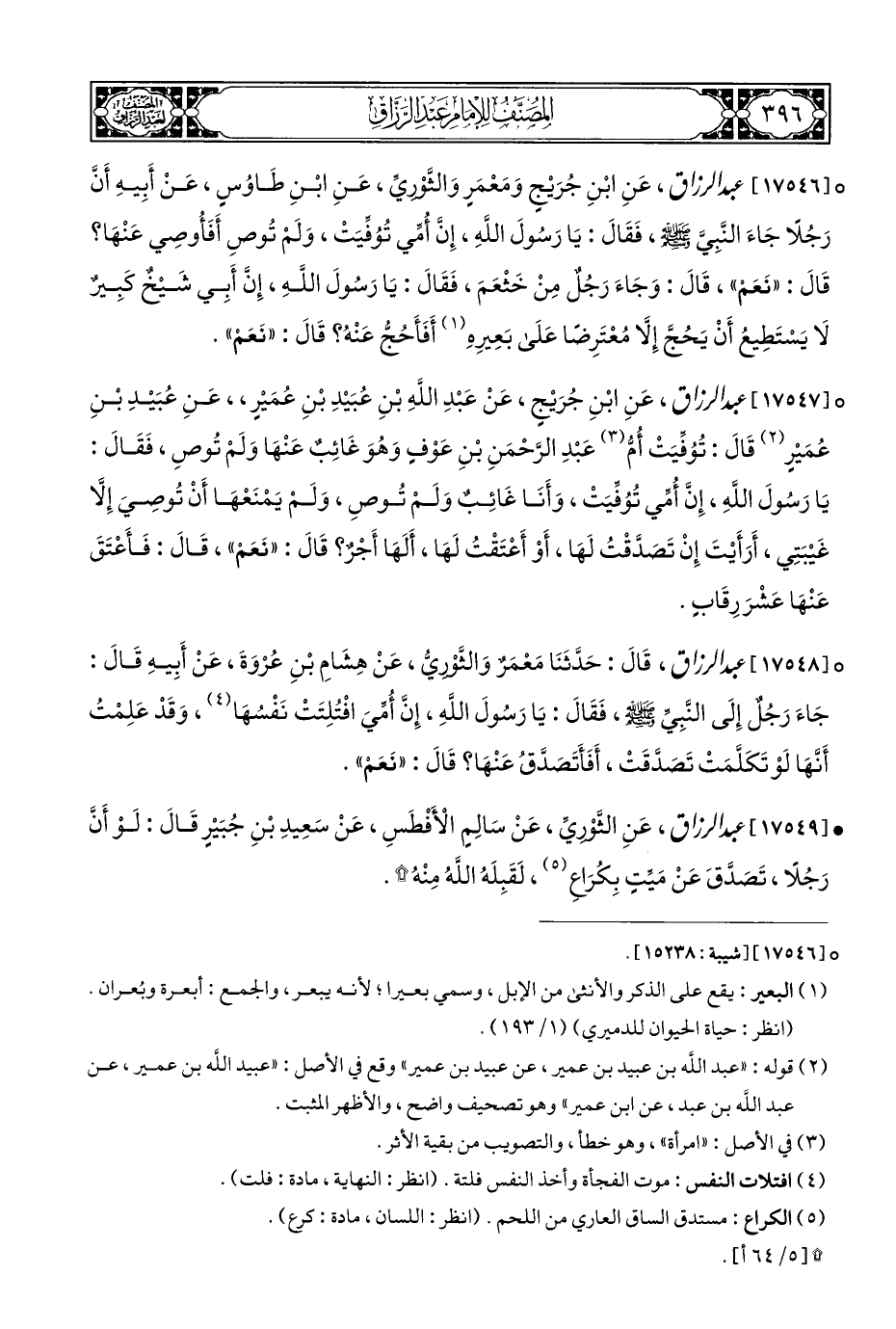 ° [١٧٥٤٧] عبد الرزاق، عَنِ ابْنِ جُرَيْجٍ، عَنْ عَبْدِ اللهِ بْنِ عُبَيْدِ بْنِ عُمَيْرٍ، عَنِ عُبَيْدِ بْنِ عُمَيْرٍ (¬٢) قَالَ: تُوُفِّيَتْ أُمُّ (¬٣) عَبْدِ الرَّحْمَنِ بْنِ عَوْفٍ وَهُوَ غَائِبٌ عَنْهَا وَلَمْ تُوصِ، فَقَالَ: يَا رَسُولَ اللهِ، إِنَّ أُمِّي تُوُفِّيَتْ، وَأَنَا غَائِبٌ وَلَمْ تُوصِ، وَلَمْ يَمْنَعْهَا أَنْ تُوصِيَ إِلَّا غَيْبَتِي، أَرَأَيْتَ إِنْ تَصَدَّقْتُ لَهَا، أَوْ أَعْتَقْتُ لَهَا، أَلَهَا أَجْرٌ؟ قَالَ: "نَعَمْ"، قَالَ: فَأَعْتَقَ عَنْهَا عَشْرَ رِقَابٍ.