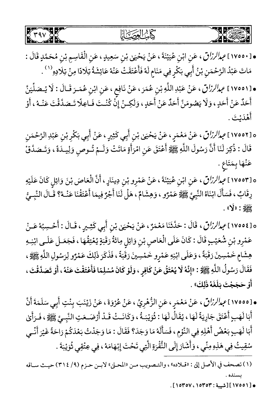• [١٧٥٥٠] عبد الرزاق، عَنِ ابْنِ عُيَيْنَةَ، عَنْ يَحْيَى بْنِ سَعِيدٍ، عَنِ الْقَاسِمِ بْنِ مُحَمَّدٍ قَالَ: مَاتَ عَبْدُ الرَّحْمَنِ بْنُ أَبِي بَكْرٍ فِي مَنَامِ لَهُ فَأَعْتَقَتْ عَنْهُ عَائِشَةُ تِلَادًا مِنْ تِلَادِهِ (¬١).