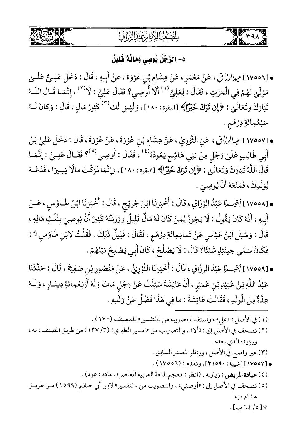 • [١٧٥٥٧] عبد الرزاق، عَنِ الثَّوْرِيِّ، عَنْ هِشَامِ بْنِ عُرْوَةَ، عَنْ عُرْوَةَ، قَالَ: دَخَلَ عَلِيُّ بْنُ أَبِي طَالِبٍ عَلَى رَجُلٍ مِنْ بَنِي هَاشِمٍ يَعُودُهُ (¬٤)، فَقَالَ: أُوصِي (¬٥)؟ فَقَالَ عَلِيٌّ: إِنَّمَا قَالَ اللهُ تَبَارَكَ وَتَعَالَى: {إِنْ تَرَكَ خَيْرًا} [البقرة: ١٨٠]، وإِنَّمَا تَرَكْتَ مَالًا يَسِيرًا، فَدَعْهُ لِوَلَدِكَ، فَمَنَعَهُ أَنْ يُوصِيَ.