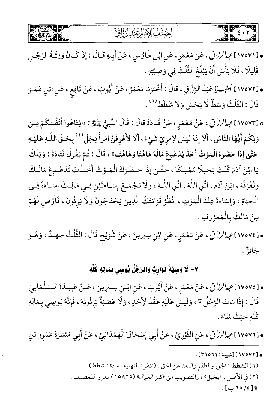 • [١٧٥٧٢] أخبرنا عَبْدُ الرَّزَّاقِ، قَالَ: أَخْبَرَنَا مَعْمَرٌ، عَنْ أَيُّوبَ، عَنْ نَافِعٍ، عَنِ ابْنِ عُمَرَ قَالَ: الثُّلُثُ وَسَطٌ لَا بَخْسَ وَلَا شَطَطَ (¬١).