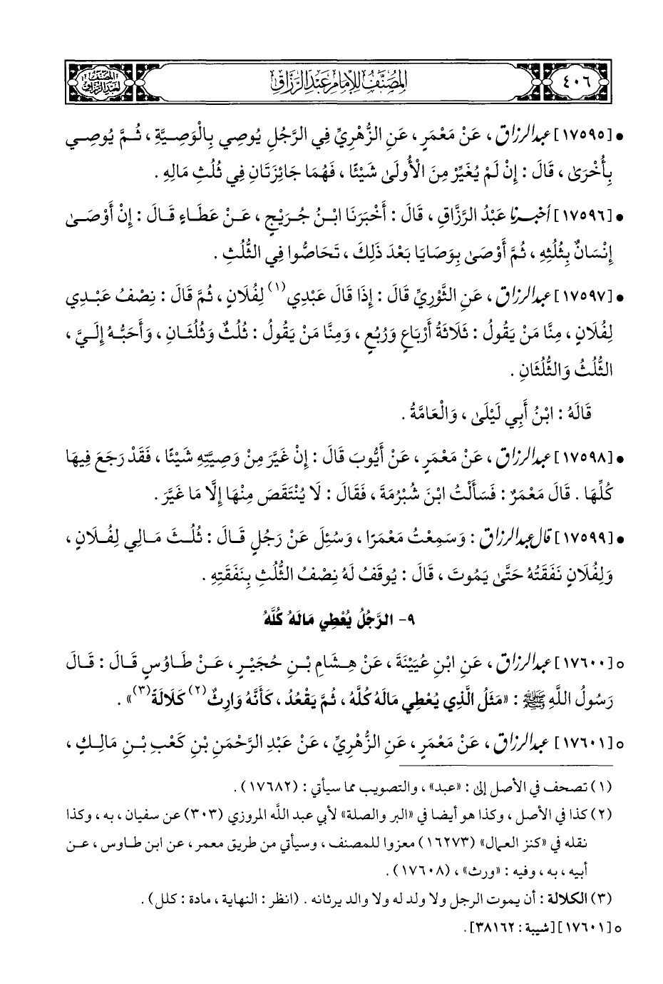 ° [١٧٦٠٠] عبد الرزاق، عَنِ ابْنِ عُيَيْنَةَ، عَنْ هِشَامِ بْنِ حُجَيْرٍ، عَنْ طَاوُسٍ قَالَ: قَالَ رَسُولُ اللهِ - صلى الله عليه وسلم -: "مَثَلُ الَّذِي يُعْطِي مَالَهُ كُلَّه، ثُمَّ يَقْعُد، كَأَنَّهُ وَارِثٌ (¬٢) كَلَالَةً (¬٣) ".