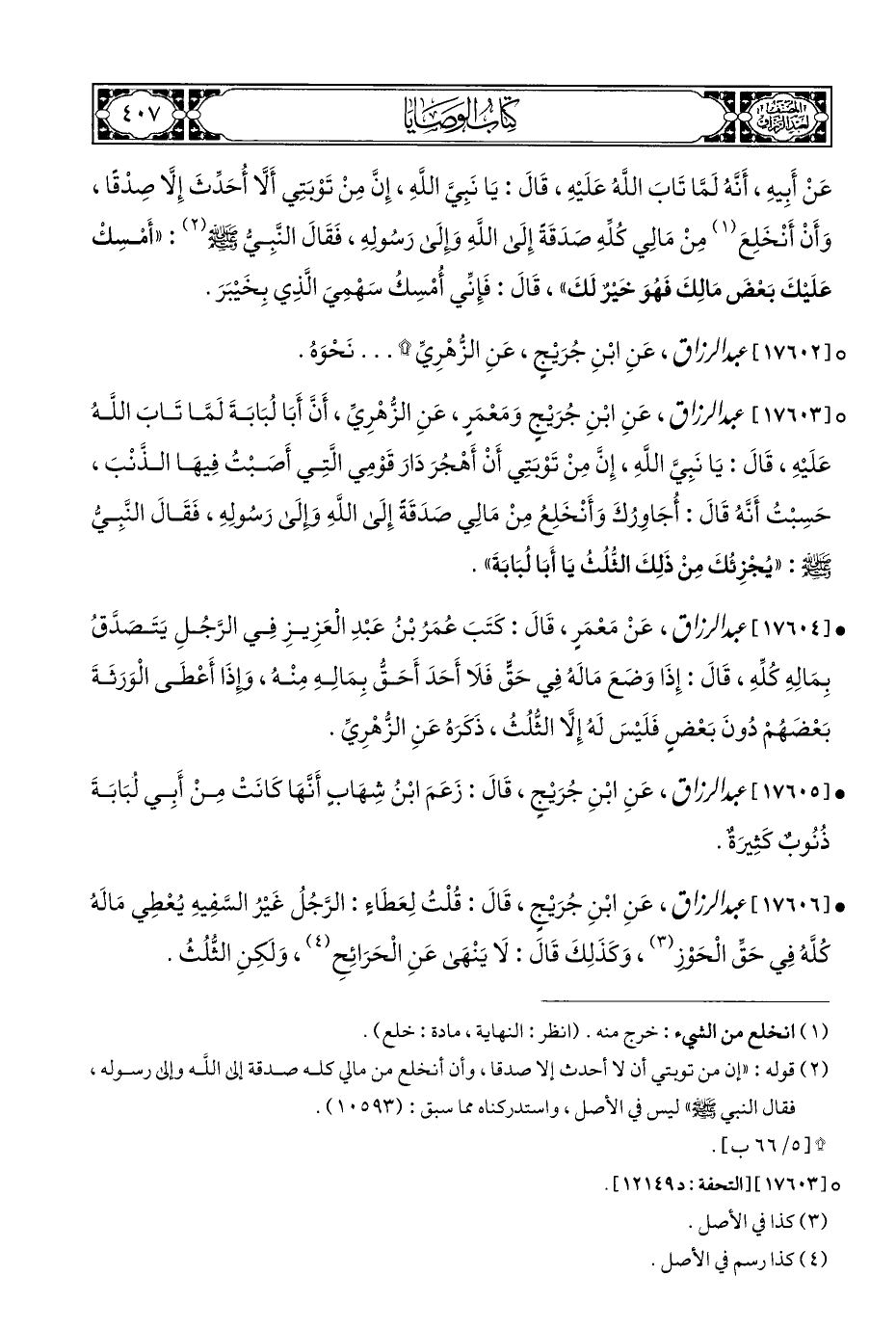 ° [١٧٦٠٣] عبد الرزاق، عَنِ ابْنِ جُرَيْجٍ وَمَعْمَرٍ، عَنِ الزُّهْرِيِّ، أَنَّ أَبَا لُبَابَةَ لَمَّا تَابَ اللهُ عَلَيْهِ، قَالَ: يَا نَبِيَّ اللهِ، إِنَّ مِنْ تَوْبَتِي أَنْ أَهْجُرَ دَارَ قَوْمِي الَّتِي أَصَبْتُ فِيهَا الذَّنْبَ، حَسِبْتُ أَنَّهُ قَالَ: أُجَاوِرُكَ وَأَنْخَلِعُ مِنْ مَالِي صَدَقَةً إِلَى اللهِ وَإِلَى رَسُولِهِ، فَقَالَ النَّبِيُّ - صلى الله عليه وسلم -: "يُجْزِئُكَ مِنْ ذَلِكَ الثُّلُثُ يَا أَبَا لُبَابَةَ".