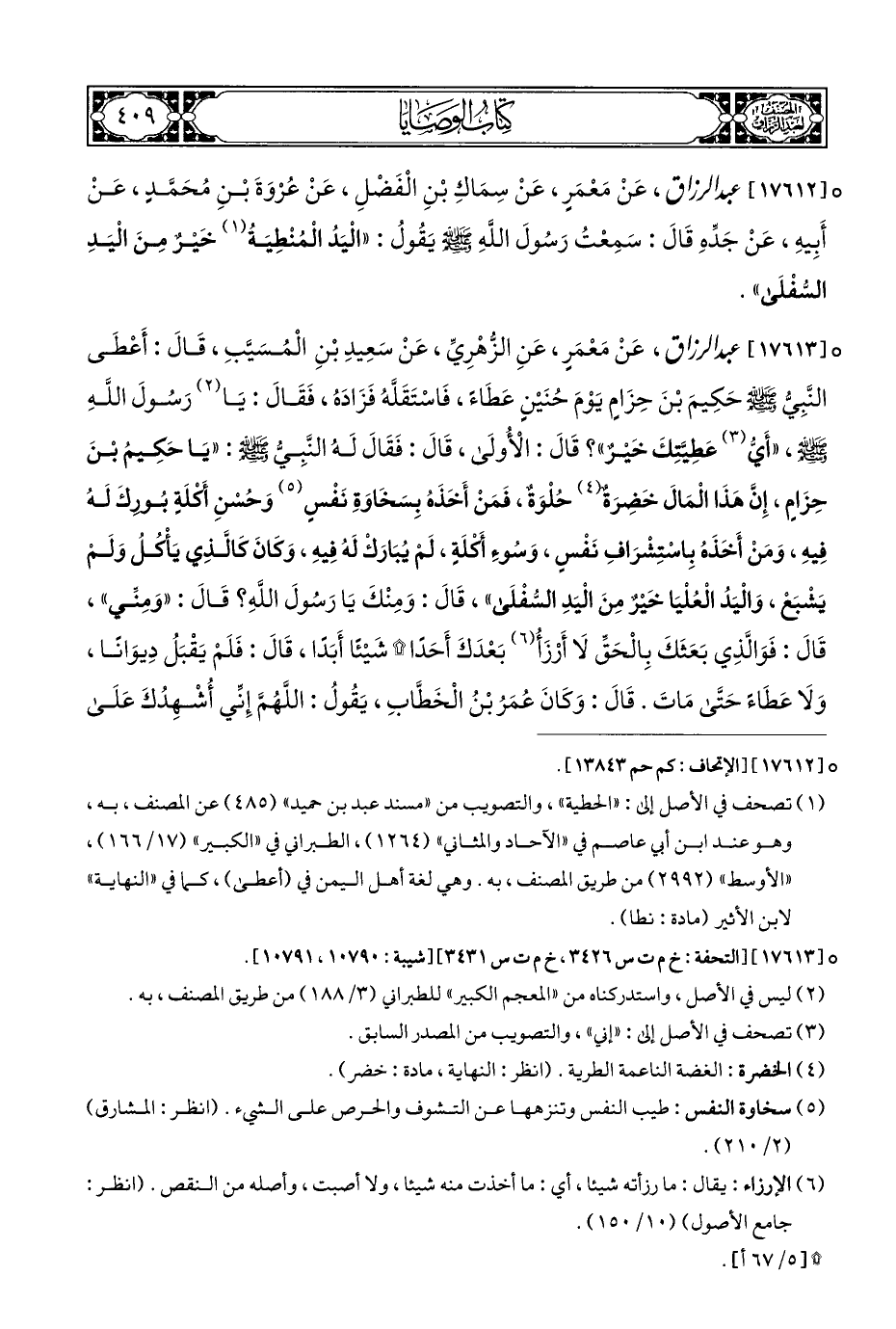 ° [١٧٦١٣] عبد الرزاق، عَنْ مَعْمَرٍ، عَنِ الزُّهْرِيِّ، عَنْ سَعِيدِ بْنِ الْمُسَيَّبِ، قَالَ: أَعْطَى النَّبِيُّ - صلى الله عليه وسلم - حَكِيمَ بْنَ حِزَامٍ يَوْمَ حُنَيْنٍ عَطَاءً، فَاسْتَقَلَّهُ فَزَادَه، فَقَالَ: يَا (¬٢) رَسُولَ اللهِ - صلى الله عليه وسلم -، "أَيُّ (¬٣) عَطِيَّتِكَ خَيْرٌ"؟ قَالَ: الْأُولَى، قَالَ: فَقَالَ لَهُ النَّبِيُّ - صلى الله عليه وسلم -: "يَا حَكِيمُ بْنَ حِزَامٍ، إِنَّ هَذَا الْمَالَ خَضِرَةٌ (¬٤) حُلْوَةٌ، فَمَنْ أَخَذَهُ بِسَخَاوَةِ نَفْسٍ (¬٥) وَحُسْنِ أَكْلَةٍ بُورِكَ لَهُ فِيهِ، وَمَنْ أَخَذَهُ بِاسْتِشْرَافِ نَفْسٍ، وَسُوءِ أَكْلَةٍ، لَمْ يُبَارَكْ لَهُ فِيهِ، وَكَانَ كَالَّذِي يَأْكُلُ وَلَمْ يَشْبَعْ، وَالْيَدُ الْعُلْيَا خَيْرٌ مِنَ الْيَدِ السُّفْلَى"، قَالَ: وَمِنْكَ يَا رَسُولَ اللهِ؟ قَالَ: "وَمِنِّي"، قَالَ: فَوَالَّذِي بَعَثَكَ بِالْحَقِّ لَا أَرْزَأُ (¬٦) بَعْدَكَ أَحَدًا (*) شَيْئًا أَبَدًا، قَالَ: فَلَمْ يَقْبَلُ دِيوَانًا، وَلَا عَطَاءً حَتَّى مَاتَ. قَالَ: وَكَانَ عُمَرُ بْنُ الْخَطَّابِ، يَقُولُ: اللَّهُمَّ إِنِّي أُشْهِدُكَ عَلَى