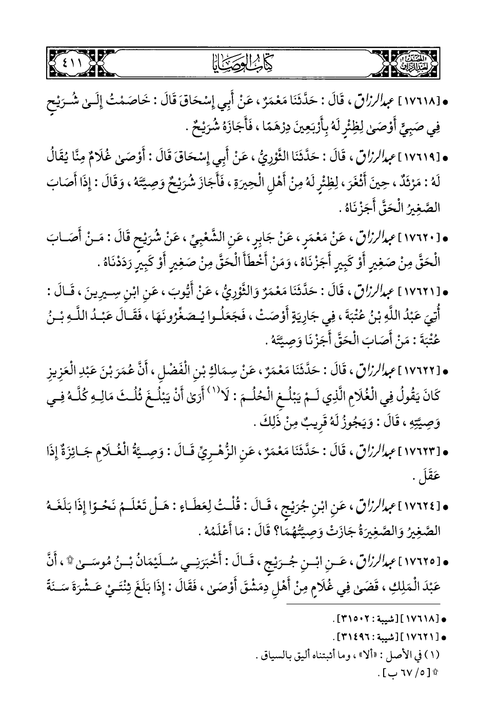 • [١٧٦١٩] عبد الرزاق، قَالَ: حَدَّثَنَا الثَّوْرِيُّ، عَنْ أَبِي إِسْحَاقَ قَالَ: أَوْصَى غُلَامٌ مِنَّا يُقَالُ لَهُ: مَرْثَدٌ، حِينَ أَثْغَرَ، لِظِئْرٍ لَهُ مِنْ أَهْلِ الْحِيرَةِ، فَأَجَازَ شُرَيْحٌ وَصِيَّتَه، وَقَالَ: إِذَا أَصَابَ الصَّغِيرُ الْحَقَّ أَجَزْنَاهُ.