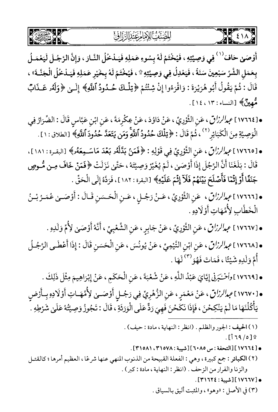 • [١٧٦٦٤] عبد الرزاق، عَنِ الثَّوْرِيِّ، عَنْ دَاوُدَ، عَنْ عَكْرِمَةَ، عَنِ ابْنِ عَبَّاسٍ قَالَ: الضِّرَارُ فِي الْوَصِيَّةِ مِنَ الْكَبَائِرِ (¬٢)، ثُمَّ قَالَ: {وَتِلْكَ حُدُودُ اللَّهِ وَمَنْ يَتَعَدَّ حُدُودَ اللَّهِ} [الطلاق: ١].