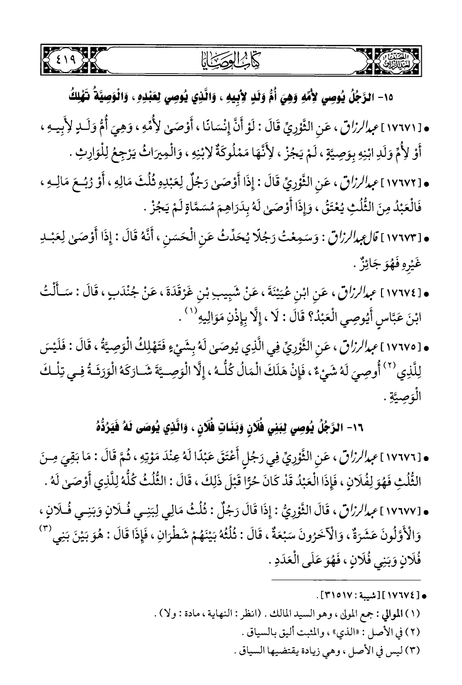 • [١٧٦٧٧] عبد الرزاق، قَالَ الثَّوْرِيُّ: إِذَا قَالَ رَجُلٌ: ثُلُثُ مَالِي لِبَنِي فُلَانٍ وَبَنِي فُلَانٍ، وَالْأَوَّلُونَ عَشَرَةٌ، وَالْآخَرُونَ سَبْعَةٌ، قَالَ: ثُلُثُهُ بَيْنَهُمْ شَطْرَانِ، فَإِذَا قَالَ: هُوَ بَيْنَ بَنِي (¬٣) فُلَانٍ وَبَنِي فُلَانٍ، فَهُوَ عَلَى الْعَدَدِ.